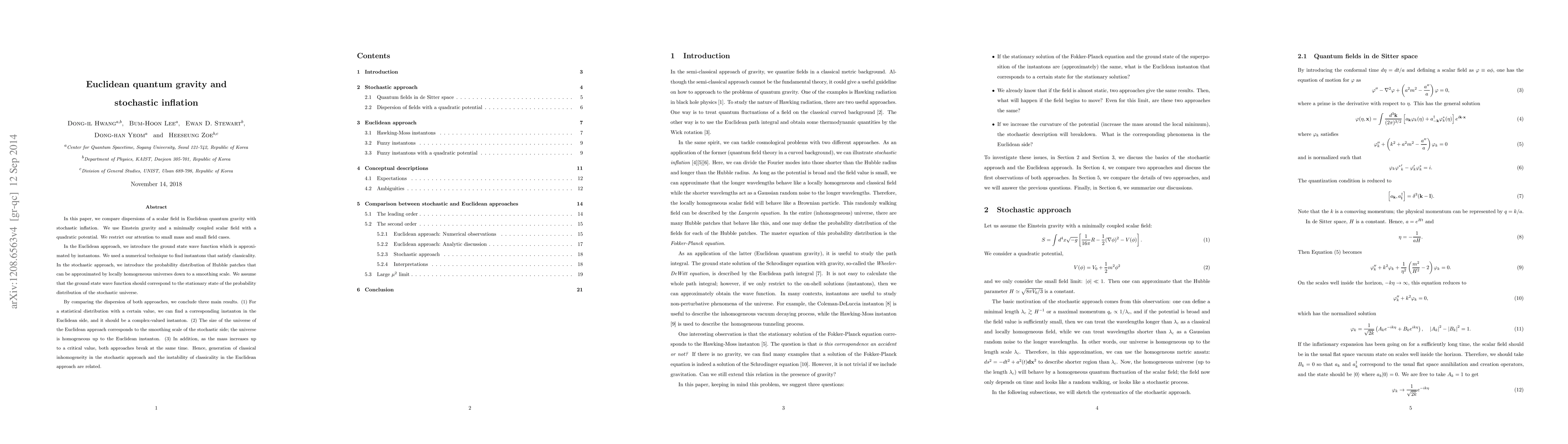 In this paper, we compare dispersions of a scalar field in Euclidean quantum gravity with stochastic inflation. We use Einstein gravity and a minimally coupled scalar field with a quadratic potential. We restrict our attention to small mass and small field cases. In the Euclidean approach, we introduce the ground state wave function which is approximated by instantons. We used a numerical technique to find instantons that satisfy classicality. In the stochastic approach, we introduce the probability distribution of Hubble patches that can be approximated by locally homogeneous universes down to a smoothing scale. We assume that the ground state wave function should correspond to the stationary state of the probability distribution of the stochastic universe. By comparing the dispersion of both approaches, we conclude three main results. (1) For a statistical distribution with a certain value, we can find a corresponding instanton in the Euclidean side, and it should be a complex-valued instanton. (2) The size of the universe of the Euclidean approach corresponds to the smoothing scale of the stochastic side; the universe is homogeneous up to the Euclidean instanton. (3) In addition, as the mass increases up to a critical value, both approaches break at the same time. Hence, generation of classical inhomogeneity in the stochastic approach and the instability of classicality in the Euclidean approach are related.