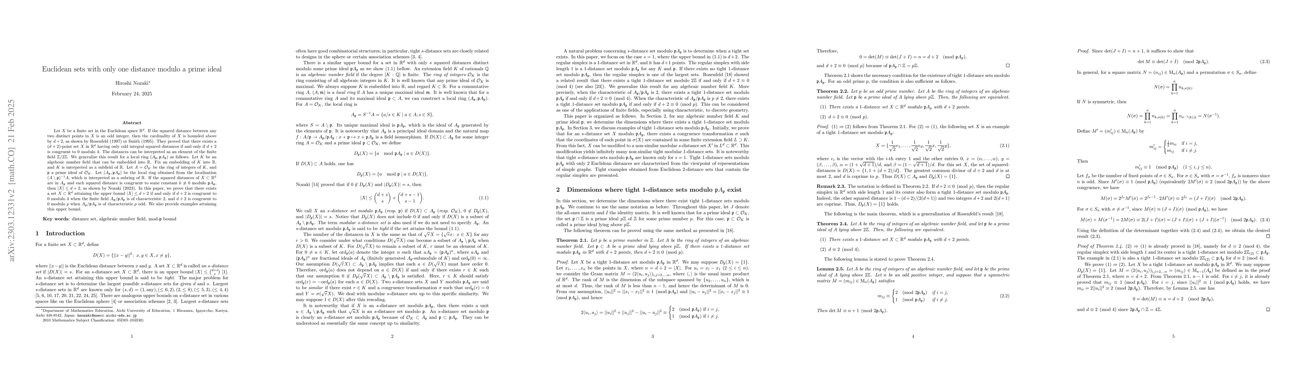 Let $X$ be a finite set in the Euclidean space $\mathbb{R}^d$. If any squared distance of two distinct points in $X$ is an odd integer, then the cardinality of $X$ is bounded above by $d+2$. Rosenfeld (1997) proved that there exists $(d+2)$-point $X$ in $\mathbb{R}^d$ having only odd integral squared distances if and only if $d+2$ is congruent to $0$ modulo $4$. The distances can be interpreted as an element of the field $\mathbb{Z}/2\mathbb{Z}$. We generalize this result for a local ring $(A_\mathfrak{p},\mathfrak{p}A_\mathfrak{p})$ as follows. Let $K$ be an algebraic number field that can be embedded into $\mathbb{R}$. Fix an embedding of $K$ into $\mathbb{R}$, and $K$ is interpreted as a subfield of $\mathbb{R}$. Let $A=\mathcal{O}_K$ be the ring of integers of $K$, and $\mathfrak{p}$ a prime ideal of $\mathcal{O}_K$. Let $(A_\mathfrak{p},\mathfrak{p}A_\mathfrak{p})$ be the local ring obtained from the localization $(A\setminus \mathfrak{p})^{-1} A$, which is interpreted as a subring of $\mathbb{R}$. If the squared distances of $X\subset \mathbb{R}^d$ are in $A_\mathfrak{p}$ and each squared distance is congruent to some constant $k \not\equiv 0 $ modulo $\mathfrak{p} A_\mathfrak{p}$, then $|X| \leq d+2$. In this paper, we prove that there exists a set $X\subset \mathbb{R}^d$ attaining the upper bound $|X| \leq d+2$ if and only if $d+2$ is congruent to $0$ modulo $4$ when the field $A_\mathfrak{p}/ \mathfrak{p} A_\mathfrak{p}$ is of characteristic 2, and $d+2$ is congruent to $0$ modulo $p$ when $A_\mathfrak{p}/ \mathfrak{p} A_\mathfrak{p}$ is of characteristic $p$ odd. We also construct examples attaining this upper bound.