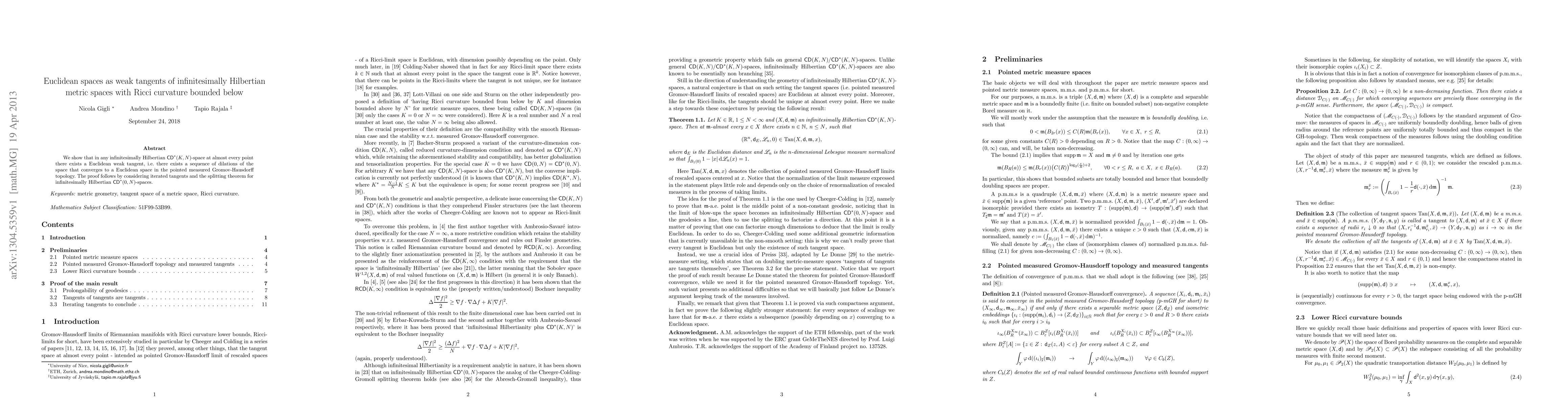 This research demonstrates that infinitesimally Hilbertian $CD^*(K,N)$-spaces nearly everywhere possess Euclidean weak tangents, achieved via a sequence of scaled space dilations converging to Euclidean space in the Gromov-Hausdorff topology. The proof leverages iterated tangents and the splitting theorem for such spaces.