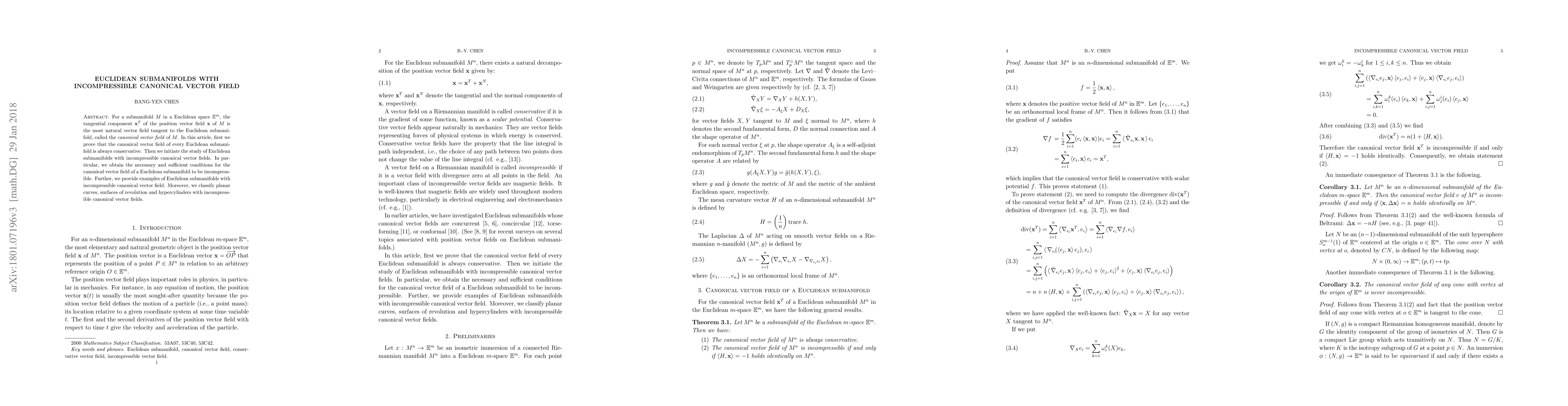 This paper investigates Euclidean submanifolds with incompressible canonical vector fields, proving necessary and sufficient conditions for incompressibility and classifying specific submanifolds with such fields.