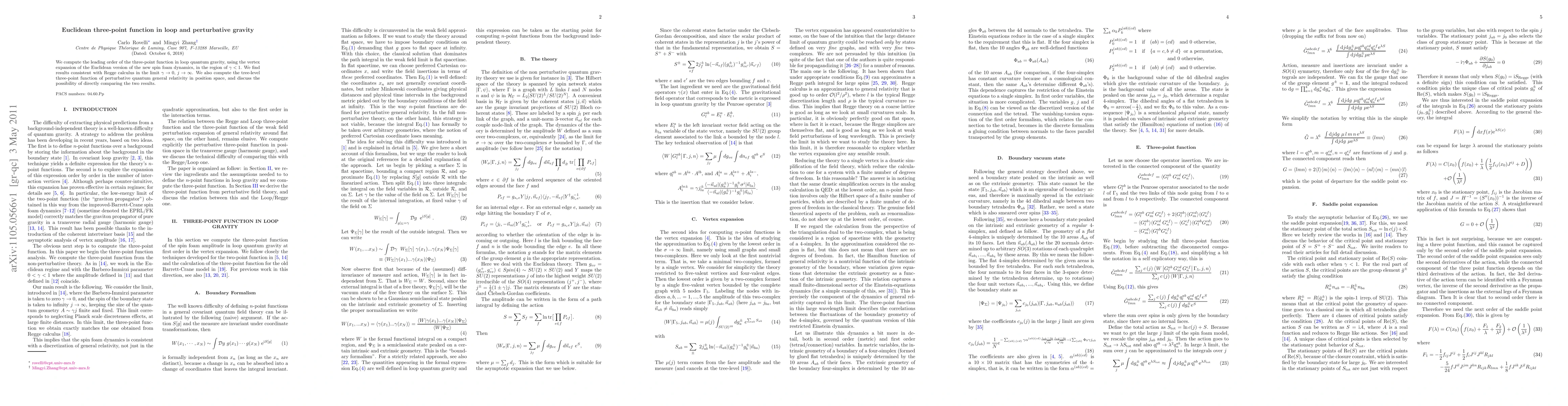 We compute the leading order of the three-point function in loop quantum gravity, using the vertex expansion of the Euclidean version of the new spin foam dynamics, in the region of gamma<1. We find results consistent with Regge calculus in the limit gamma->0 and j->infinity. We also compute the tree-level three-point function of perturbative quantum general relativity in position space, and discuss the possibility of directly comparing the two results.