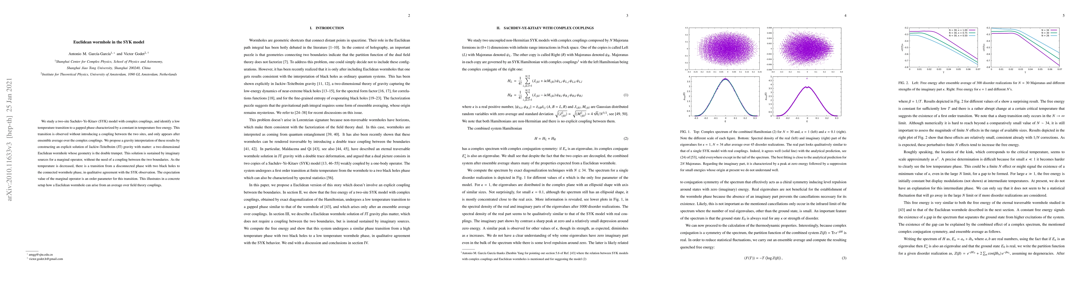 This paper investigates a two-site SYK model with complex couplings, revealing a low-temperature transition to a gapped phase. It proposes a gravity interpretation through a Euclidean wormhole solution in JT gravity, showing a transition from disconnected black holes to a connected wormhole phase as temperature decreases.
