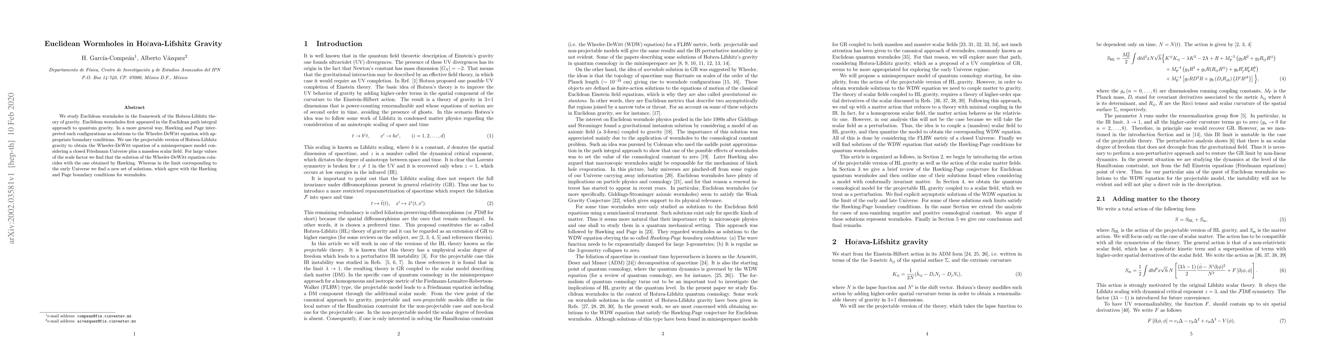 This paper explores Euclidean wormholes within the Horava-Lifshitz theory of gravity, finding that the Wheeler-DeWitt equation in the projectable model yields solutions consistent with Hawking's results for large scale factors, while revealing new solutions for early Universe conditions.