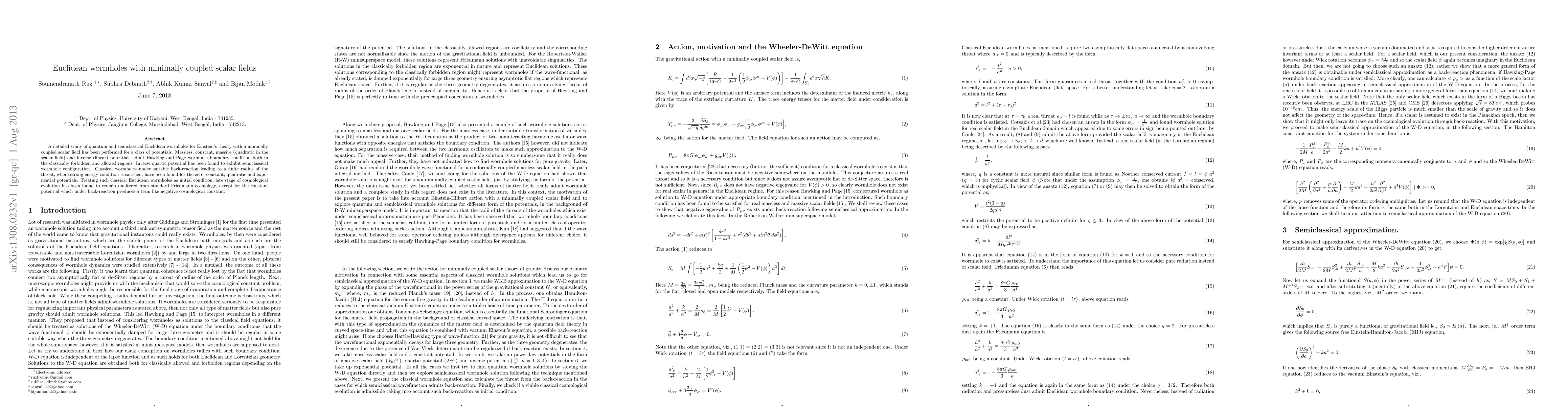 This paper investigates Euclidean wormholes in Einstein's theory with a minimally coupled scalar field, finding that various potentials allow for both Hawking and Page wormhole boundary conditions and semiclassical configurations. Classical wormholes with a finite throat radius are also identified under suitable back-reaction, though only the constant potential alters late-stage cosmological evolution by introducing a negative cosmological constant effect.