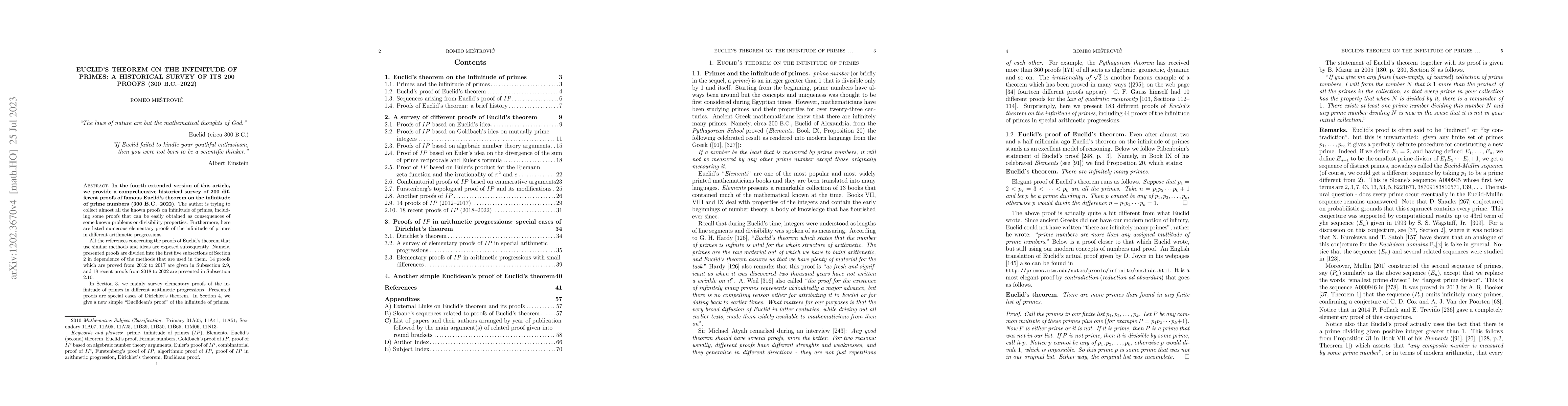 This paper provides a comprehensive historical survey of over 200 proofs of Euclid's theorem on the infinitude of prime numbers from 300 B.C. to 2022, including recent proofs and elementary proofs in different arithmetic progressions. The author also presents a new simple "Euclidean" proof of the theorem.