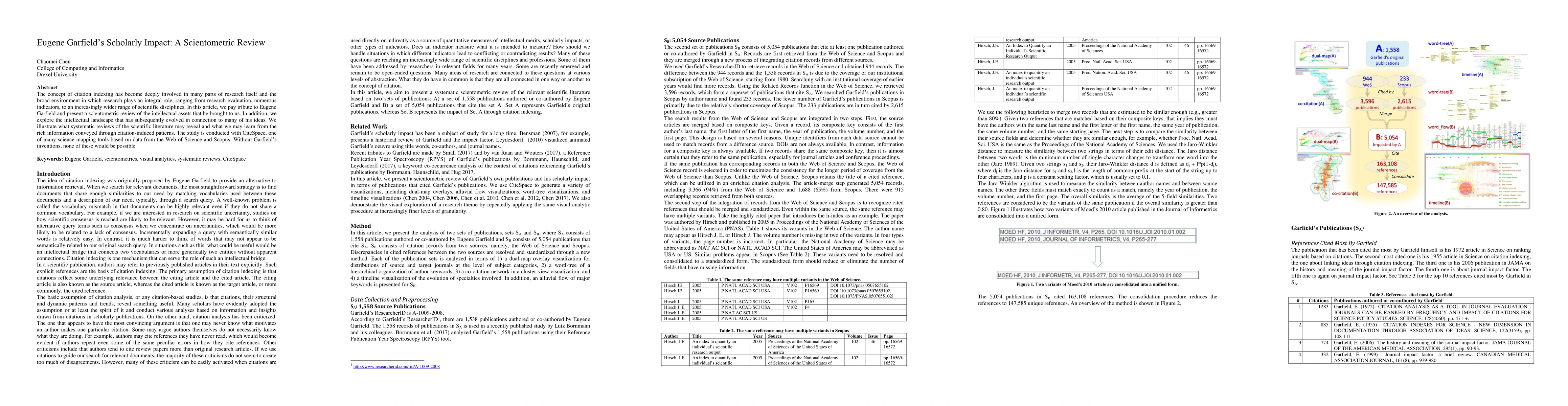 The concept of citation indexing has become deeply involved in many parts of research itself and the broad environment in which research plays an integral role, ranging from research evaluation, numerous indicators, to an increasingly wider range of scientific disciplines. In this article, we pay tribute to Eugene Garfield and present a scientometric review of the intellectual assets that he brought to us. In addition, we explore the intellectual landscape that has subsequently evolved in connection to many of his ideas. We illustrate what systematic reviews of the scientific literature may reveal and what we may learn from the rich information conveyed through citation-induced patterns. The study is conducted with CiteSpace, one of many science mapping tools based on data from the Web of Science and Scopus. Without Garfield's inventions, none of these would be possible.