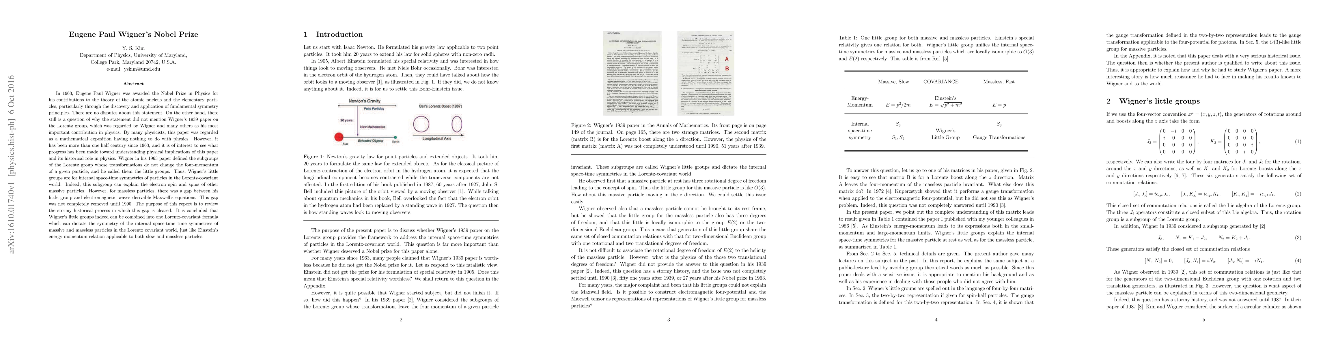 Eugene Paul Wigner was awarded the 1963 Nobel Prize in Physics for his contributions to atomic nucleus and elementary particle theory, notably through symmetry principles. Despite this, his 1939 paper on the Lorentz group, considered by many as his most significant work, was not mentioned in the Nobel citation. This paper introduced "little groups" that explain the internal space-time symmetries of particles, bridging the gap between massive and massless particles only fully resolved in 1990.