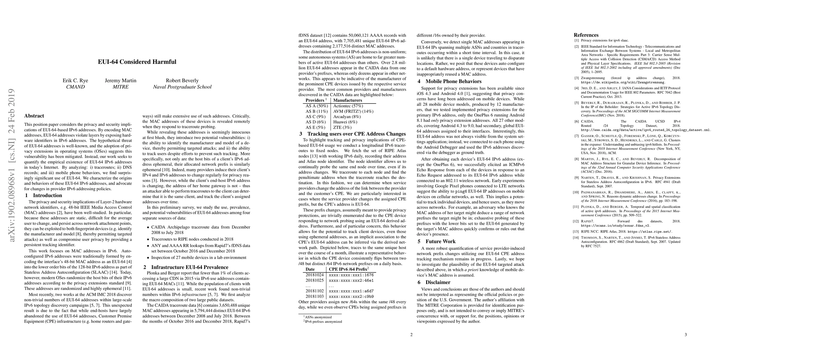 The paper analyzes the prevalence of EUI-64 IPv6 addresses on the internet, finding significant use despite known security concerns, and advocates for changes in provider policies.