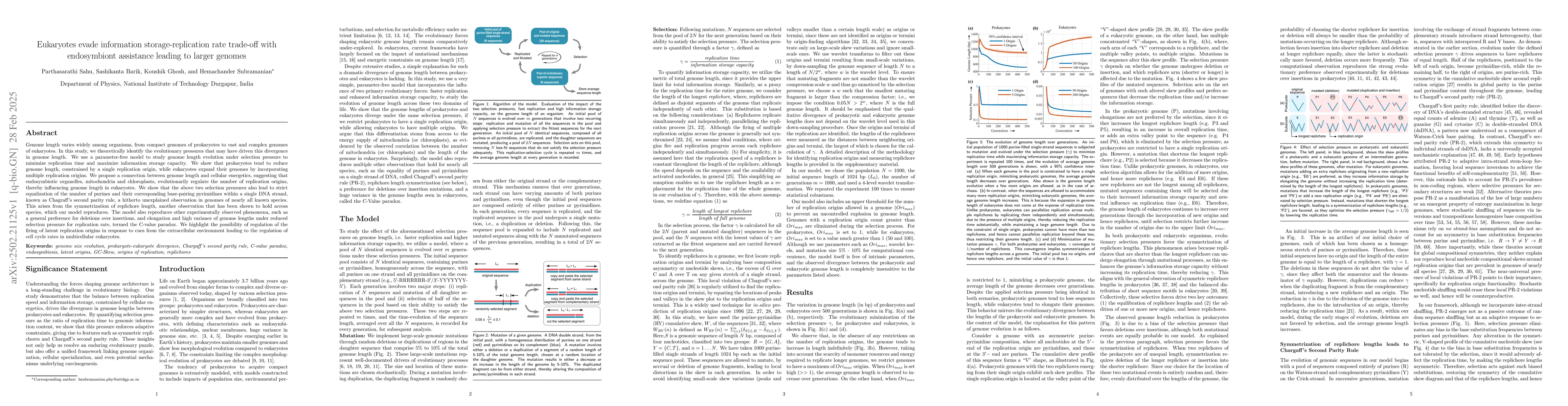 This study proposes that eukaryotes evade the trade-off between replication speed and information storage by expanding their genomes through the use of multiple replication origins, facilitated by endosymbiotic organelles. The model also explains the prevalence of Chargaff's second parity rule and the C-value paradox, suggesting environmental cues may regulate latent replication origins in multicellular eukaryotes.