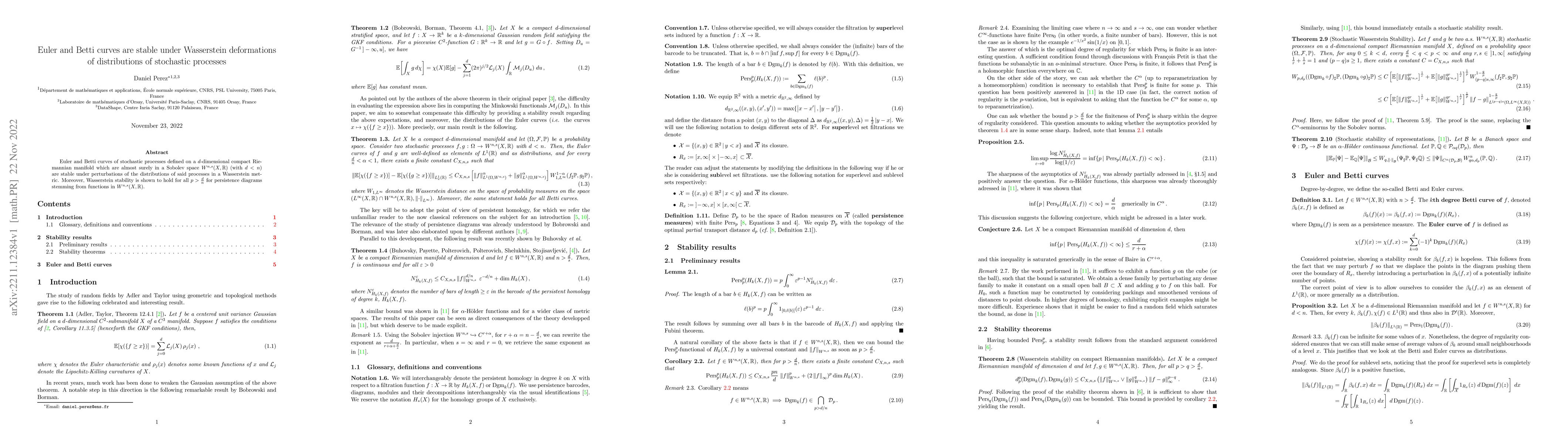 This paper demonstrates that Euler and Betti curves of stochastic processes on a compact Riemannian manifold remain stable under Wasserstein metric perturbations of their distributions. It also proves Wasserstein stability for persistence diagrams from functions in Sobolev space $W^{n,s}(X,\mathbb{R})$ for $p>\frac{d}{n}$.