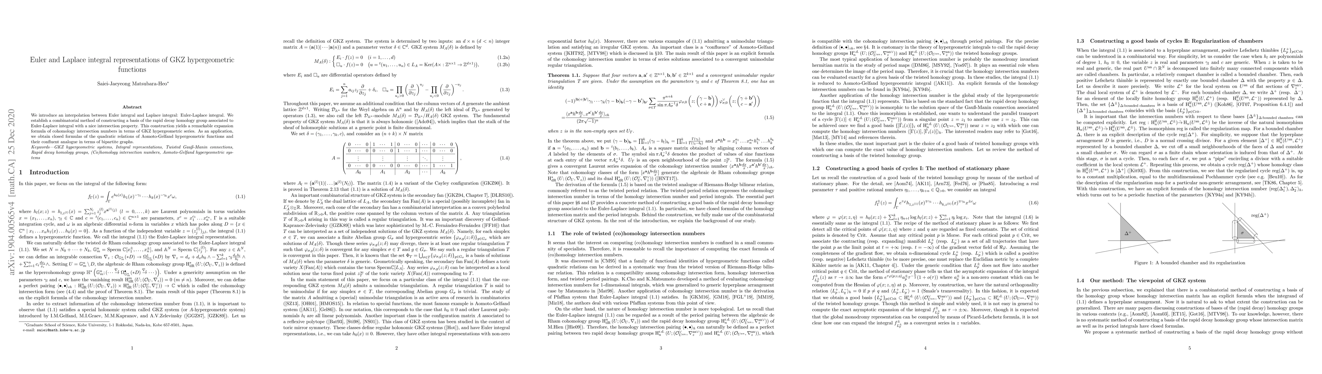 We introduce an interpolation between Euler integral and Laplace integral: Euler-Laplace integral. We establish a combinatorial method of constructing a basis of the rapid decay homology group associated to Euler-Laplace integral with a nice intersection property. This construction yields a remarkable expansion formula of cohomology intersection numbers in terms of GKZ hypergeometric series. As an application, we obtain closed formulas of the quadratic relations of Aomoto-Gelfand hypergeometric functions and their confluent analogue in terms of bipartite graphs.