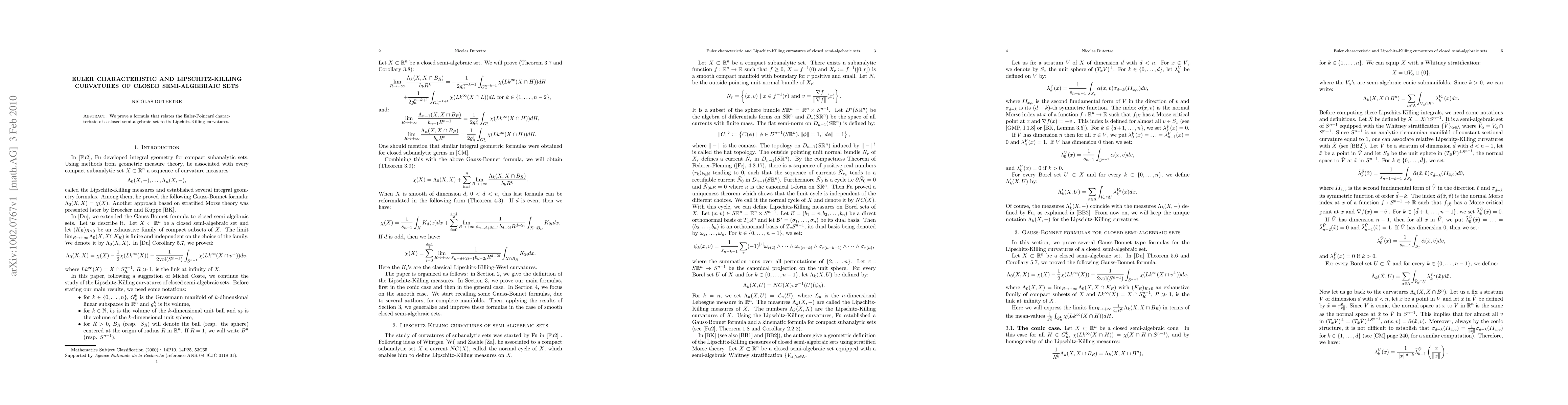 Summary: The paper establishes a formula connecting the Euler-Poincaré characteristic of closed semi-algebraic sets to their Lipschitz-Killing curvatures, providing new insights into geometric properties of these sets.