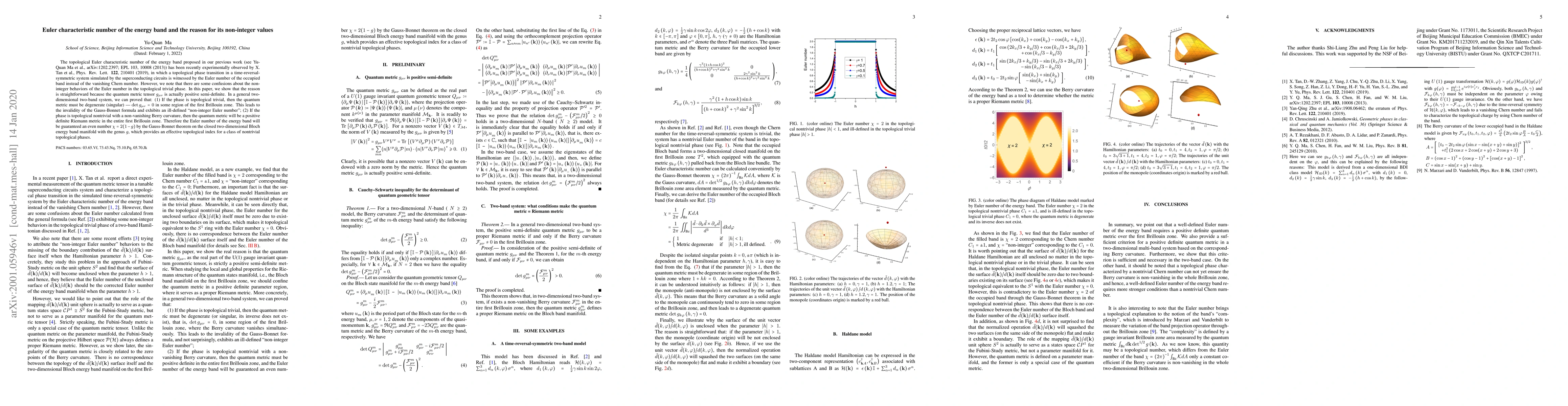 The topological Euler characteristic number of the energy band proposed in our previous work (see Yu-Quan Ma et al., arXiv:1202.2397; EPL 103, 10008 (2013)) has been recently experimentally observed by X. Tan et al., Phys. Rev. Lett. \textbf{122}, 210401 (2019), in which a topological phase transition in a time-reversal-symmetric system simulated by the superconducting circuits is witnessed by the Euler number of the occupied band instead of the vanishing Chern number. However, we note that there are some confusions about the non-integer behaviors of the Euler number in the topological trivial phase. In this paper, we show that the reason is straightforward because the quantum metric tensor $g_{\mu \nu} $ is actually positive semi-definite. In a general two-dimensional two-band system, we can proved that: (1) If the phase is topological trivial, then the quantum metric must be degenerate (singular)~--- $\det {g_{\mu \nu} }=0$ in some region of the first Brillouin zone. This leads to the invalidity of the Gauss-Bonnet formula and exhibits an ill-defined ``non-integer Euler number''; (2) If the phase is topological nontrivial with a non-vanishing Berry curvature, then the quantum metric will be a positive definite Riemann metric in the entire first Brillouin zone. Therefore the Euler number of the energy band will be guaranteed an even number $\chi=2(1-g)$ by the Gauss-Bonnet theorem on the closed two-dimensional Bloch energy band manifold with the genus $g$, which provides an effective topological index for a class of nontrivial topological phases.