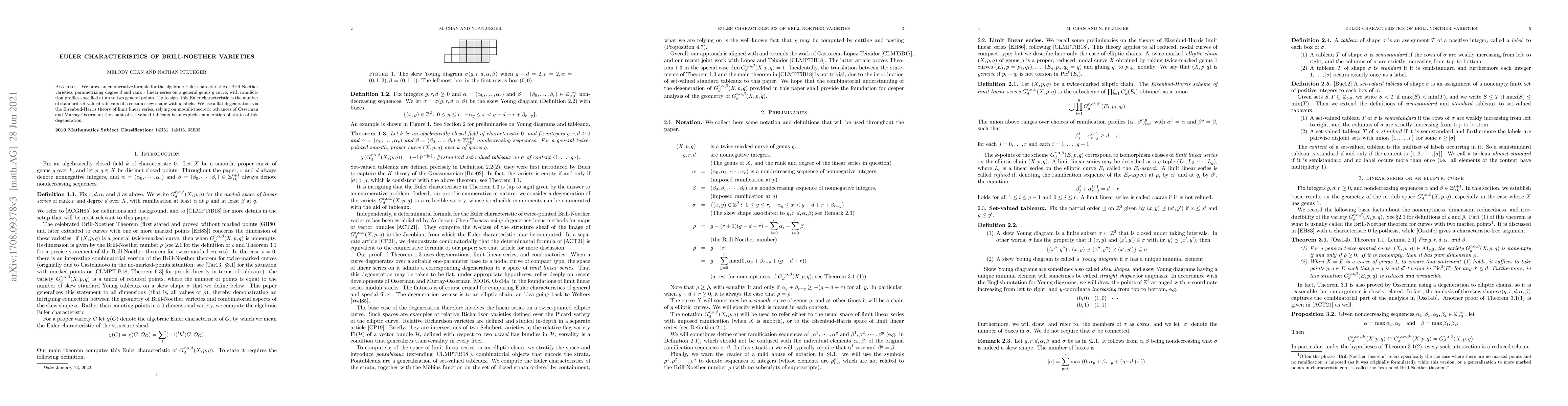 We prove an enumerative formula for the algebraic Euler characteristic of Brill-Noether varieties, parametrizing degree d and rank r linear series on a general genus g curve, with ramification profiles specified at up to two general points. Up to sign, this Euler characteristic is the number of standard set-valued tableaux of a certain skew shape with g labels. We use a flat degeneration via the Eisenbud-Harris theory of limit linear series, relying on moduli-theoretic advances of Osserman and Murray-Osserman; the count of set-valued tableaux is an explicit enumeration of strata of this degeneration.