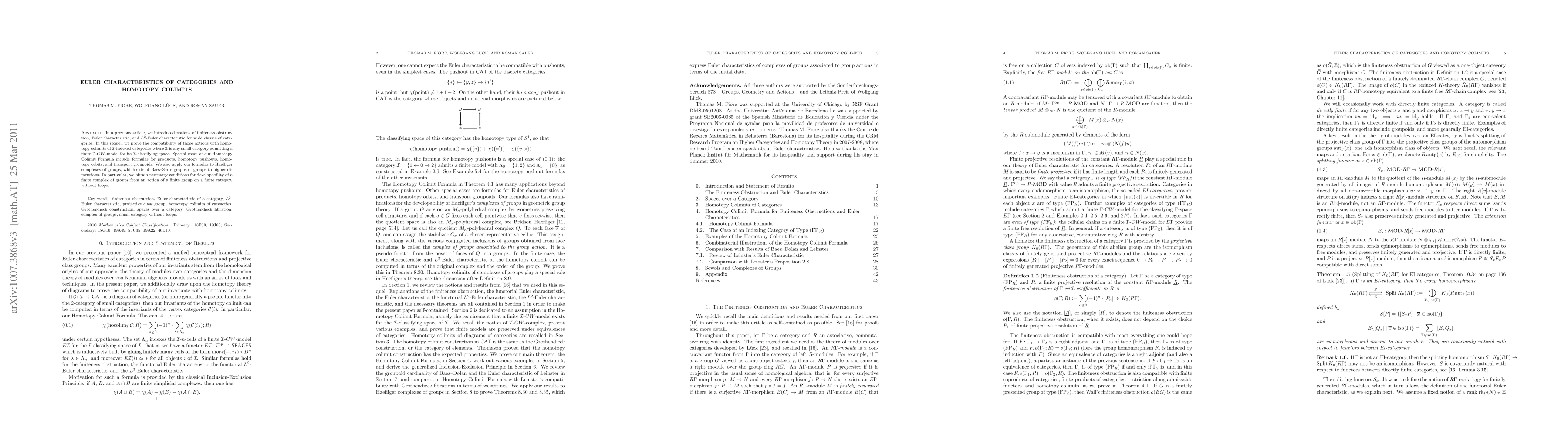 This paper extends previous work on Euler characteristics for categories, proving their compatibility with homotopy colimits in I-indexed categories, including specific cases like products and homotopy pushouts. It also applies these results to higher-dimensional group complexes, deriving conditions for the developability of finite complexes of groups from group actions on finite categories.