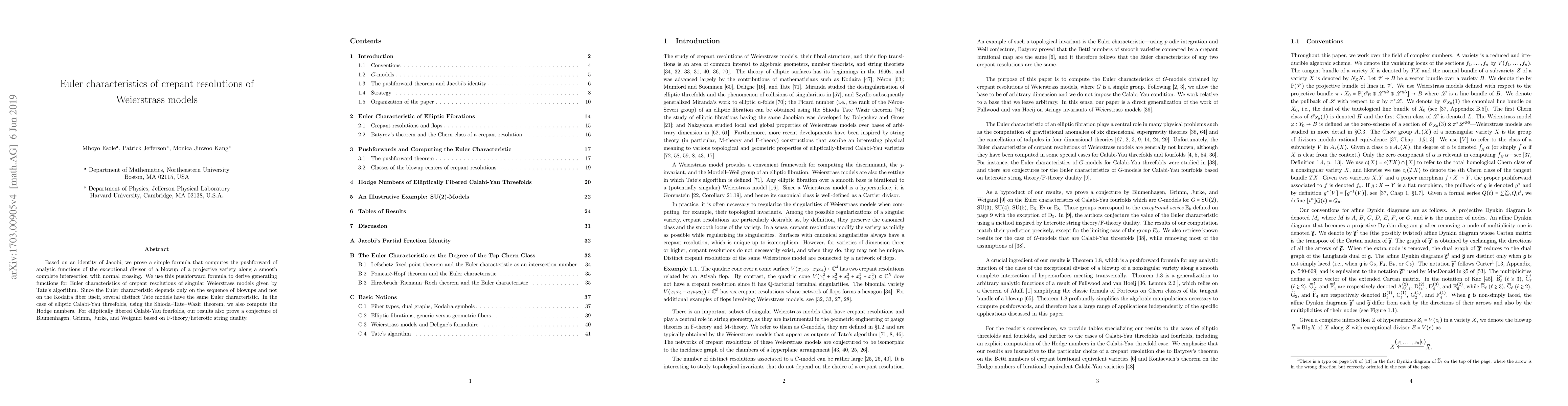 Based on an identity of Jacobi, we prove a simple formula that computes the pushforward of analytic functions of the exceptional divisor of a blowup of a projective variety along a smooth complete intersection with normal crossing. We apply this pushforward formula to derive generating functions for Euler characteristics of crepant resolutions of singular Weierstrass models given by Tate's algorithm. Since these Euler characteristics depend only on the sequence of blowups and not on the Kodaira fiber itself, nor the associated group, several distinct Tate models have the same Euler characteristic. In the case of elliptic Calabi-Yau threefolds, we also compute the Hodge numbers. For elliptically fibered Calabi-Yau fourfolds, our results also prove a conjecture of Blumenhagen-Grimm-Jurke-Weigand based on F-theory/heterotic string duality.