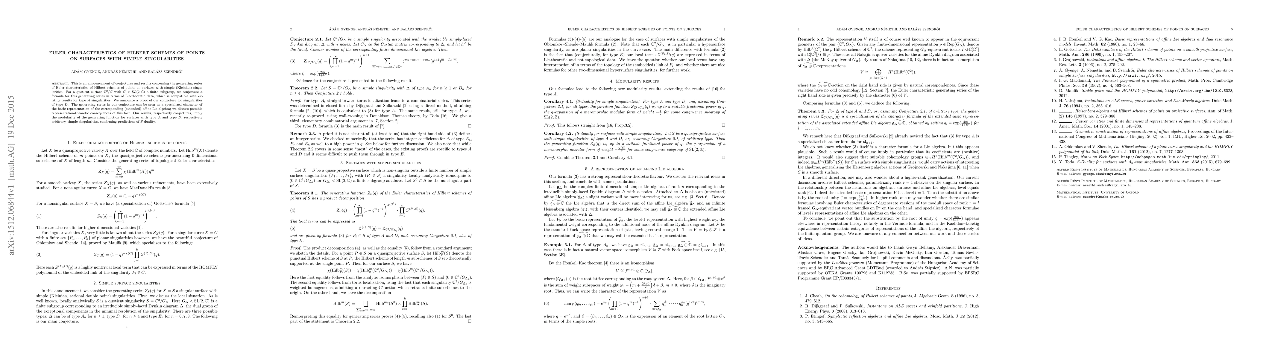 This is an announcement of conjectures and results concerning the generating series of Euler characteristics of Hilbert schemes of points on surfaces with simple (Kleinian) singularities. For a quotient surface C^2/G with G a finite subgroup of SL(2, C), we conjecture a formula for this generating series in terms of Lie-theoretic data, which is compatible with existing results for type A singularities. We announce a proof of our conjecture for singularities of type D. The generating series in our conjecture can be seen as a specialized character of the basic representation of the corresponding (extended) affine Lie algebra; we discuss possible representation-theoretic consequences of this fact. Our results, respectively conjectures, imply the modularity of the generating function for surfaces with type A and type D, respectively arbitrary, simple singularities, confirming predictions of S-duality.