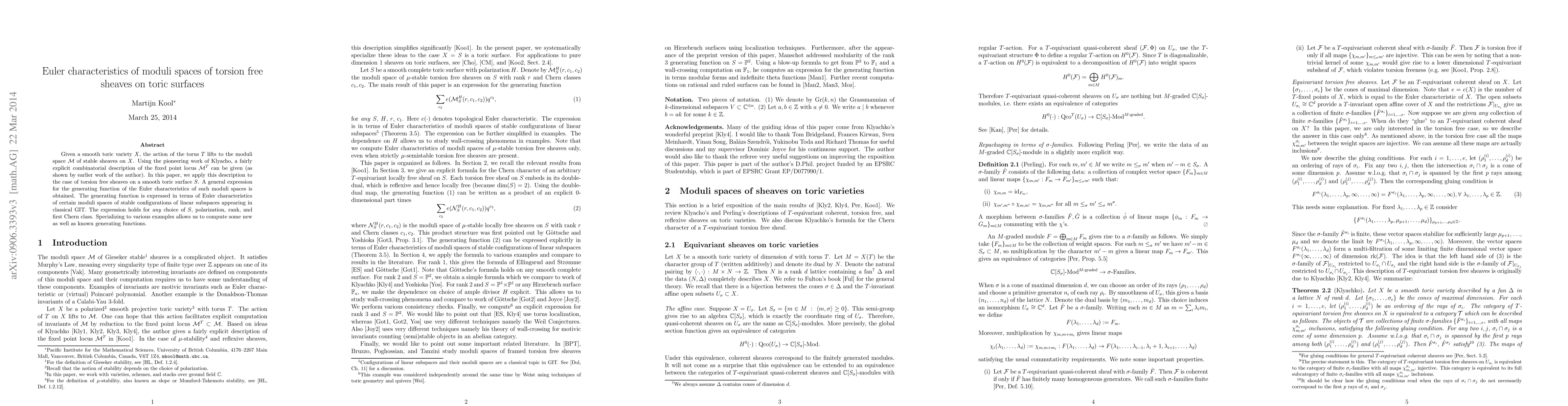 This paper calculates the Euler characteristics of moduli spaces for torsion-free sheaves on smooth toric surfaces by leveraging combinatorial descriptions of fixed points in the moduli space under torus action. A general generating function for these Euler characteristics is derived and shown to depend on the Euler characteristics of related moduli spaces of linear subspaces.