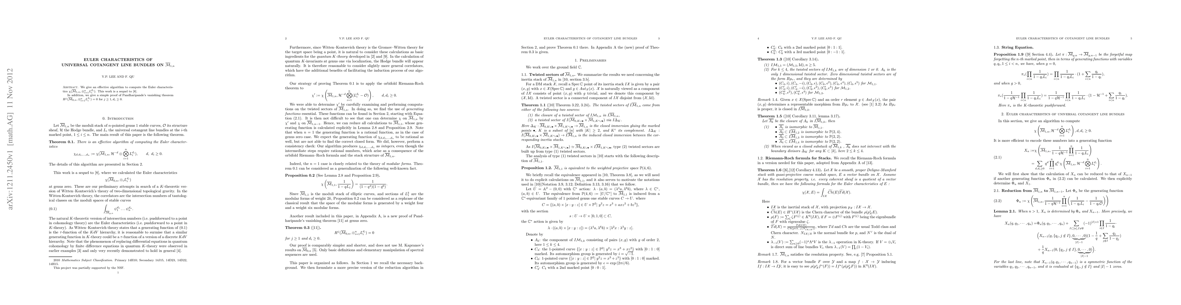 This paper presents an algorithm for calculating the Euler characteristics of universal cotangent line bundles on $\mbar_{1,n}$ and provides a straightforward proof for Pandharipande's vanishing theorem for certain higher cohomology groups on $\mbar_{0,n}$.