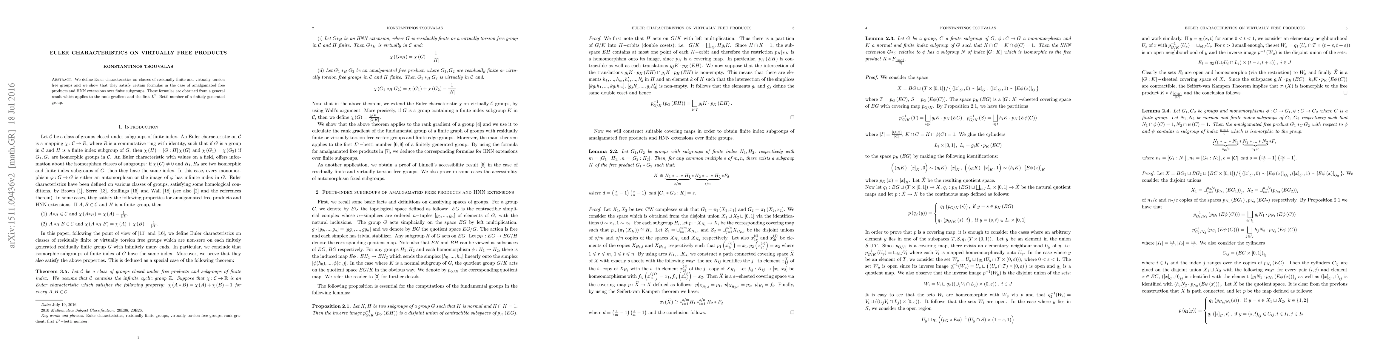 This paper defines Euler characteristics for residually finite and virtually torsion-free groups and demonstrates their behavior in amalgamated free products and HNN extensions over finite subgroups. The results are derived from a broader framework applied to rank gradient and first $L^2$-Betti numbers of finitely generated groups.