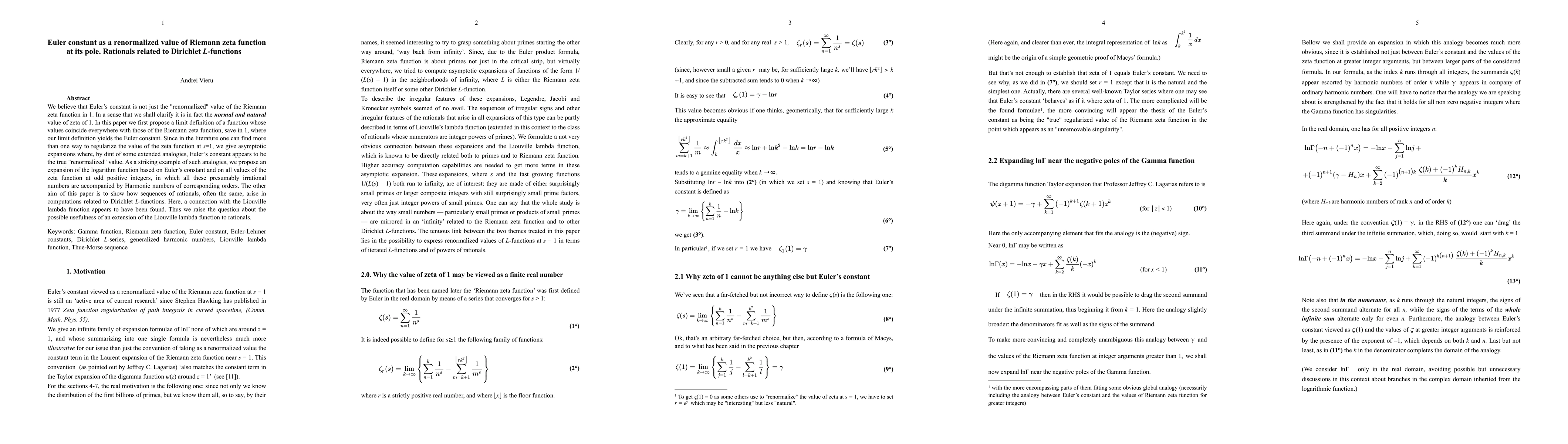 We believe that Euler constant is not just the "renormalized" value of the Riemann zeta function in 1. In a sense that we shall clarify it is in fact the normal and natural value of zeta of 1. In this paper we first propose a limit definition of a function whose values coincide everywhere with those of the Riemann zeta function, save in 1, where our limit definition yields the Euler constant. Since in the literature one can find more than one way to regularize the value of the zeta function at s=1, we give asymptotic expansions where, by dint of some extended analogies, Euler constant appears to be the true "renormalized" value. As a striking example of such analogies, we propose an expansion of the logarithm function based on Euler constant and on all values of the zeta function at odd positive integers, in which all these presumably irrational numbers are accompanied by Harmonic numbers of corresponding orders. The other aim of this paper is to show how sequences of rationals, often the same, arise in computations related to Dirichlet L-functions. Here, a connection with the Liouville lambda function appears to have been found. Thus we raise the question about the possible usefulness of an extension of the Liouville lambda function to rationals. .