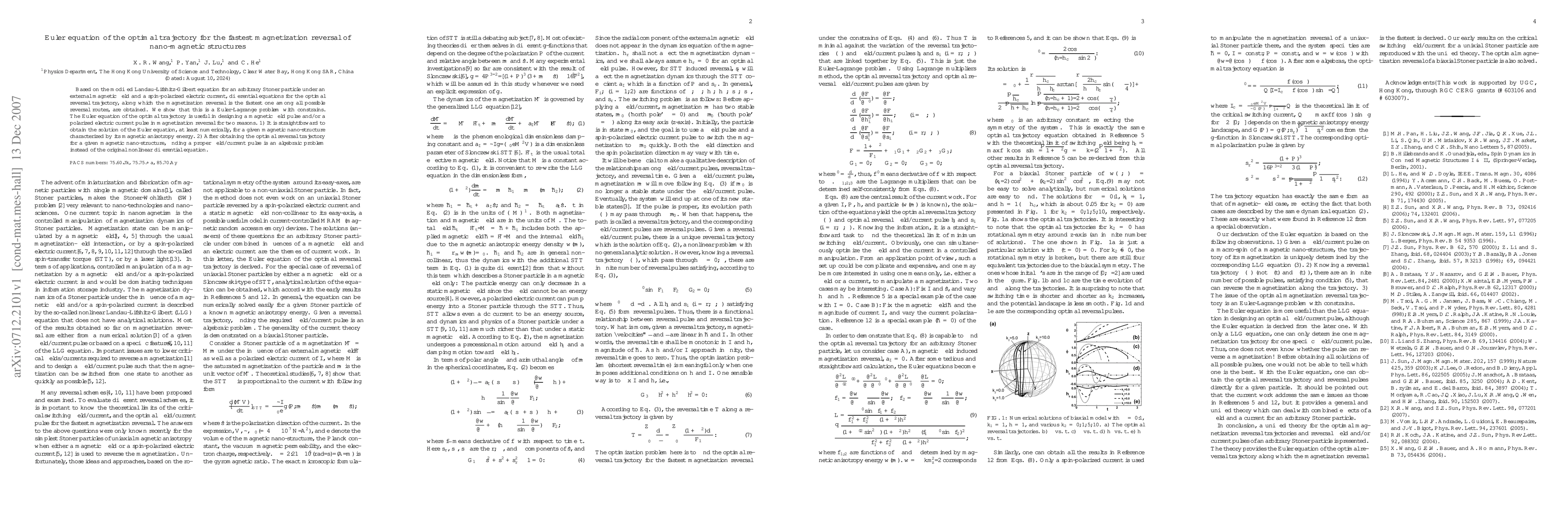 This paper derives the Euler equation for the optimal trajectory that achieves the fastest magnetization reversal in nano-magnetic structures, based on the modified Landau-Lifshitz-Gilbert equation. The solution facilitates designing magnetic field or electric current pulses for efficient magnetization reversal, simplifying the problem from a nonlinear differential equation to an algebraic one.