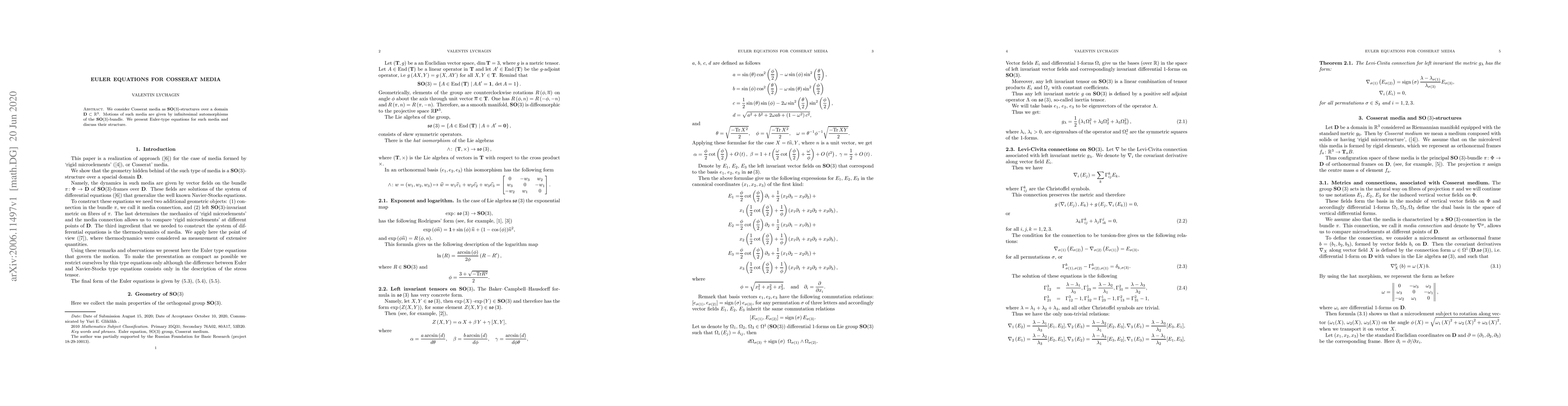 We consider Cosserat media as SO(3)-structures over a domain D in R3. Motions of such media are given by automorphisms of the SO(3)-bundle. We present Euler-type equations for such media and discuss their structure.