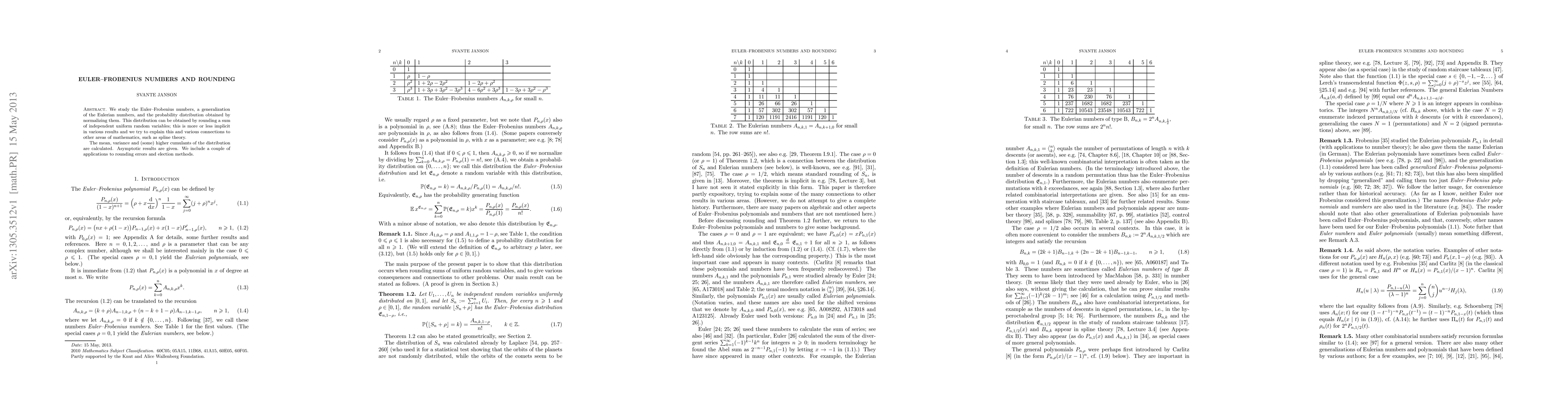 We study the Euler-Frobenius numbers, a generalization of the Eulerian numbers, and the probability distribution obtained by normalizing them. This distribution can be obtained by rounding a sum of independent uniform random variables; this is more or less implicit in various results and we try to explain this and various connections to other areas of mathematics, such as spline theory. The mean, variance and (some) higher cumulants of the distribution are calculated. Asymptotic results are given. We include a couple of applications to rounding errors and election methods.