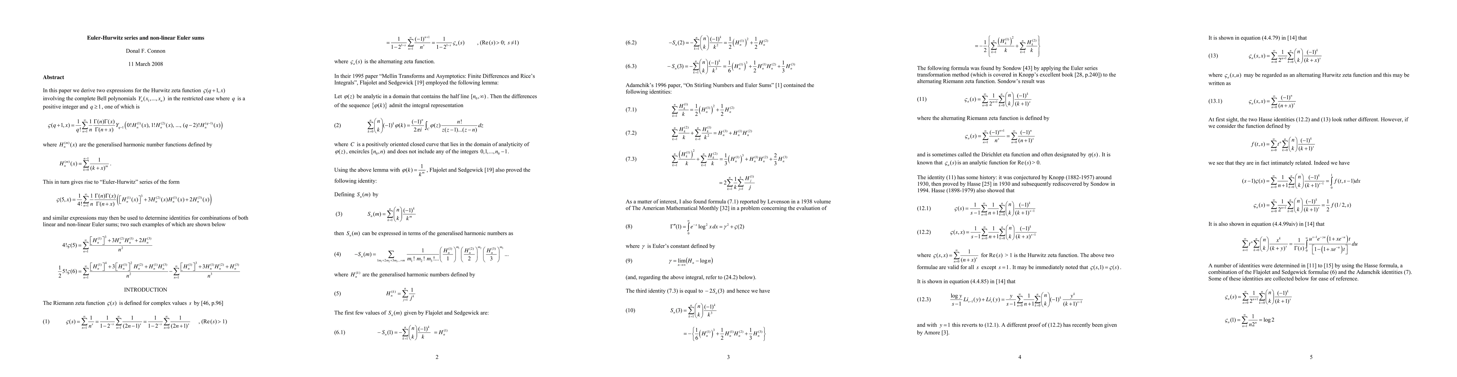 This paper derives two expressions for the Hurwitz zeta function using complete Bell polynomials and generalised harmonic numbers, leading to Euler-Hurwitz series that help identify identities for linear and non-linear Euler sums.