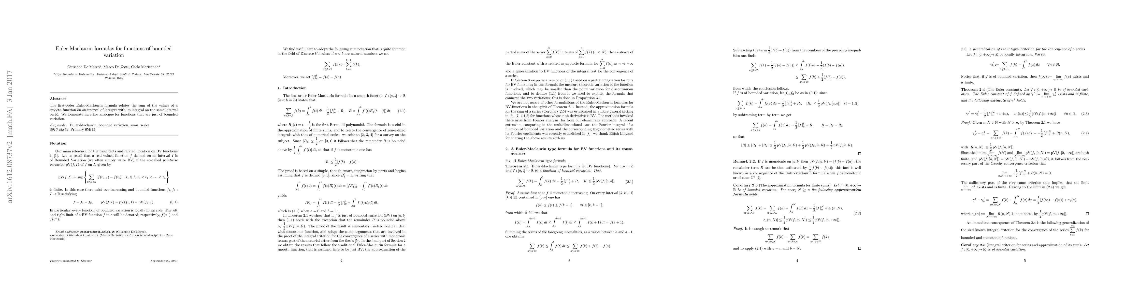 This paper develops an Euler-Maclaurin formula for functions of bounded variation, relating their sum on integer intervals to their integral on the same interval, extending a known result to non-smooth functions.