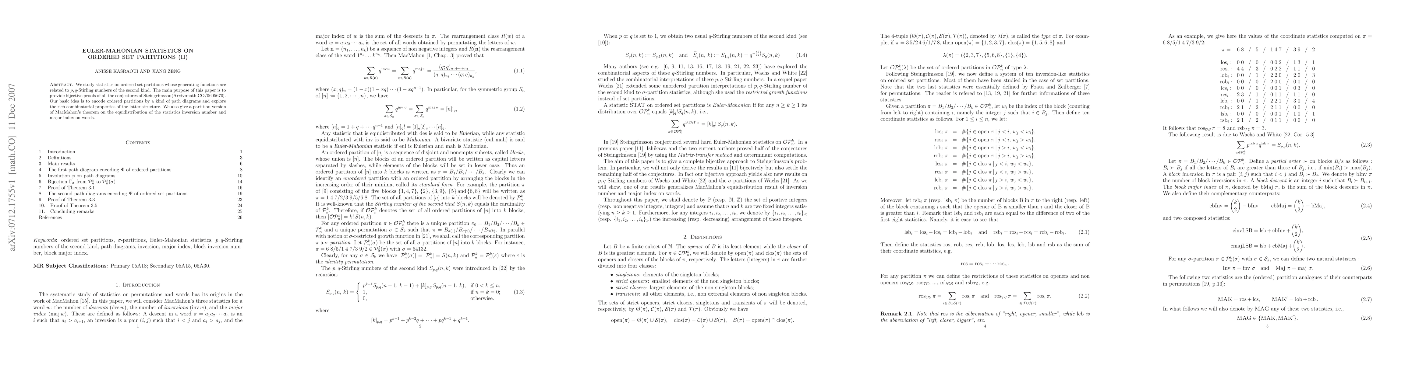 This paper provides bijective proofs for conjectures related to Euler-Mahonian statistics on ordered set partitions, using path diagrams to encode partitions and explores their combinatorial properties. It also extends MacMahon's theorem to the equidistribution of inversion number and major index on partitions.