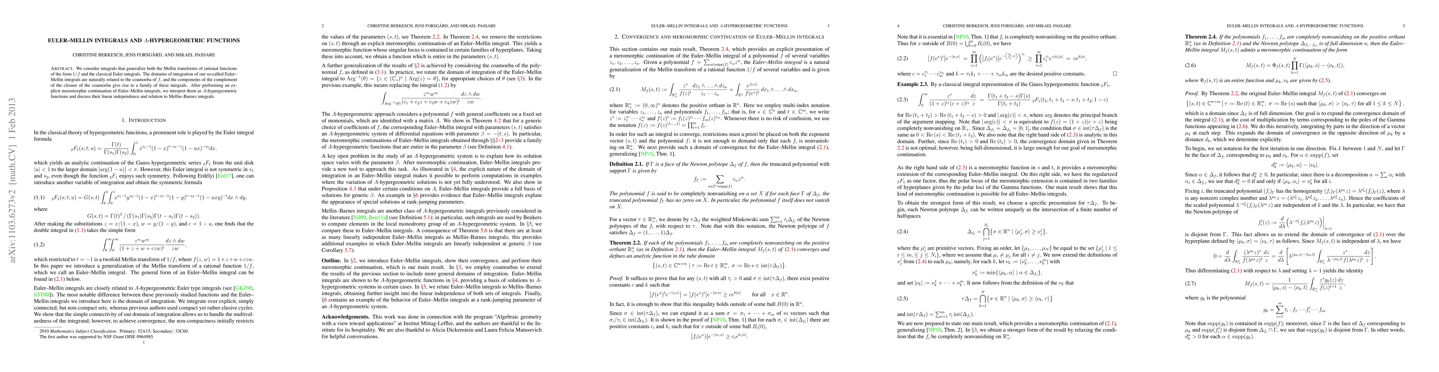 This paper explores Euler--Mellin integrals, which generalize both Mellin transforms and classical Euler integrals, and relates their domains to the coamoeba of functions. It performs a meromorphic continuation and interprets these integrals as A-hypergeometric functions, discussing their linear independence and connections to Mellin--Barnes integrals.