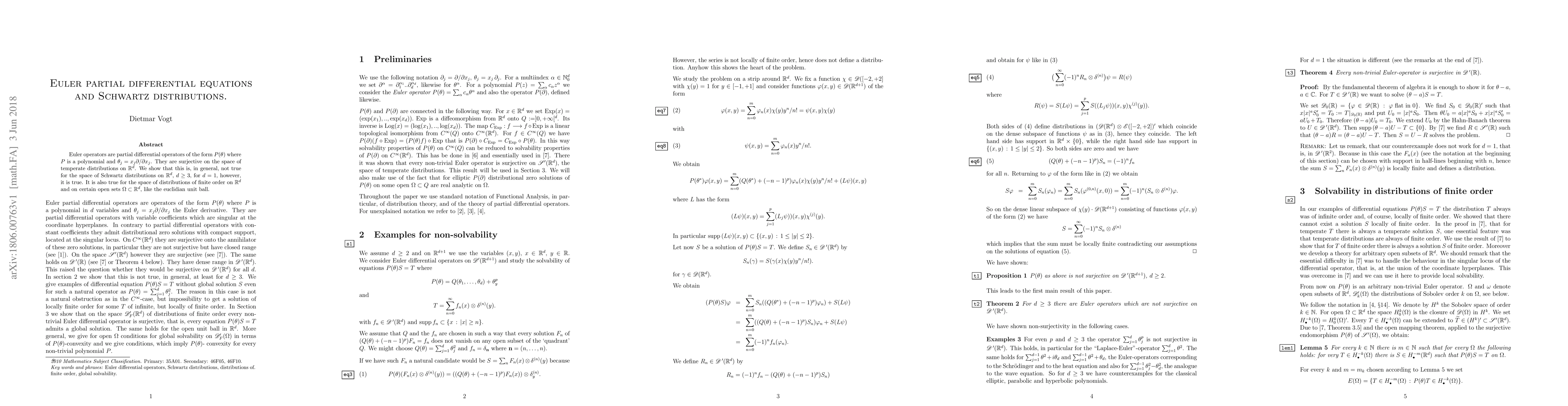 This paper investigates Euler partial differential operators and their surjectivity on various spaces of distributions. It finds that Euler operators are surjective on temperate distributions but not on Schwartz distributions in dimensions $d \geq 3$, except for $d=1$. They are also surjective on distributions of finite order and on specific open sets like the Euclidean unit ball.