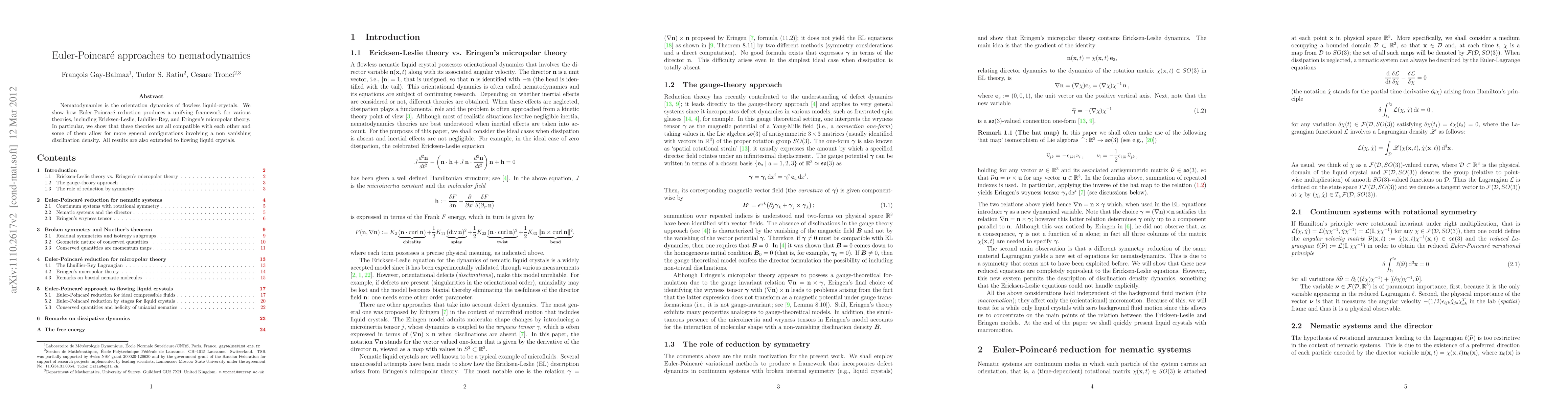 This paper utilizes Euler-Poincaré reduction to unify various theories of nematodynamics, including Ericksen-Leslie, Luhiller-Rey, and Eringen's micropolar theory, demonstrating their compatibility and extending results to flowing liquid crystals, with some accommodating non-vanishing disclination density.