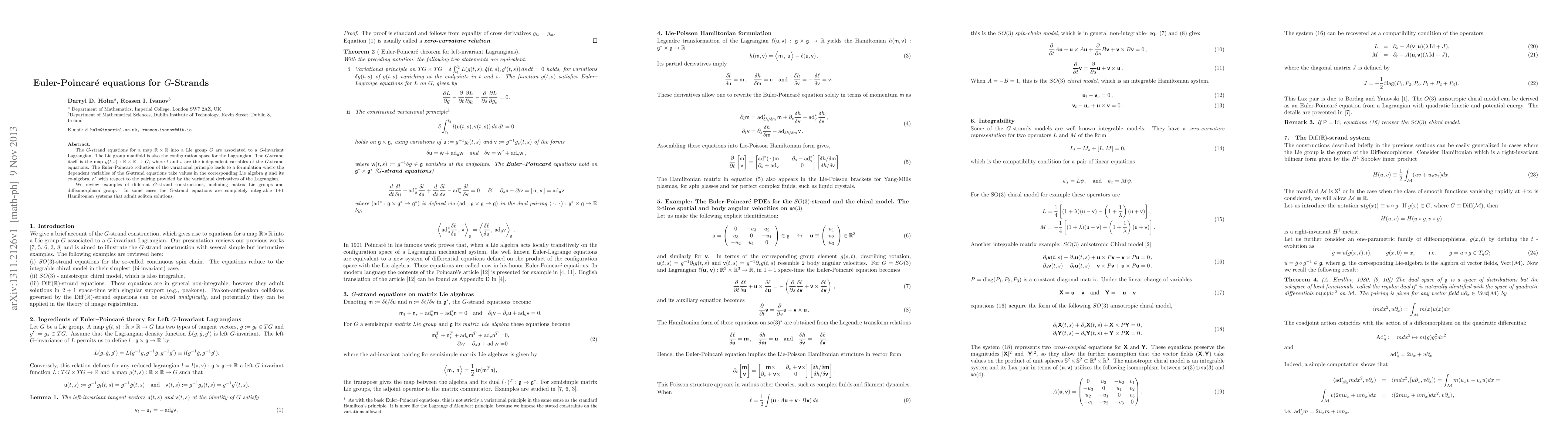 The paper introduces a formulation for $G$-strand equations using Euler-Poincaré reduction, which leads to integrable Hamiltonian systems with soliton solutions for certain Lie groups.