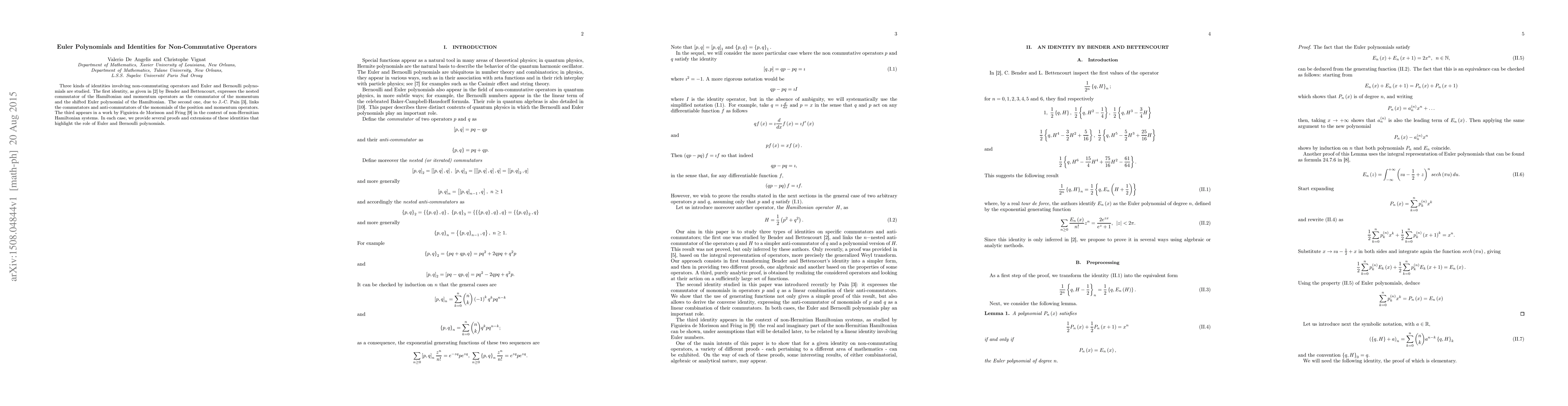 Three kinds of identities involving non-commutating operators and Euler and Bernoulli polynomials are studied. The first identity, as given by Bender and Bettencourt, expresses the nested commutator of the Hamiltonian and momentum operators as the commutator of the momentum and the shifted Euler polynomial of the Hamiltonian. The second one, due to J.-C. Pain, links the commutators and anti-commutators of the monomials of the position and momentum operators. The third appears in a work by Figuieira de Morisson and Fring in the context of non-Hermitian Hamiltonian systems. In each case, we provide several proofs and extensions of these identities that highlight the role of Euler and Bernoulli polynomials.
