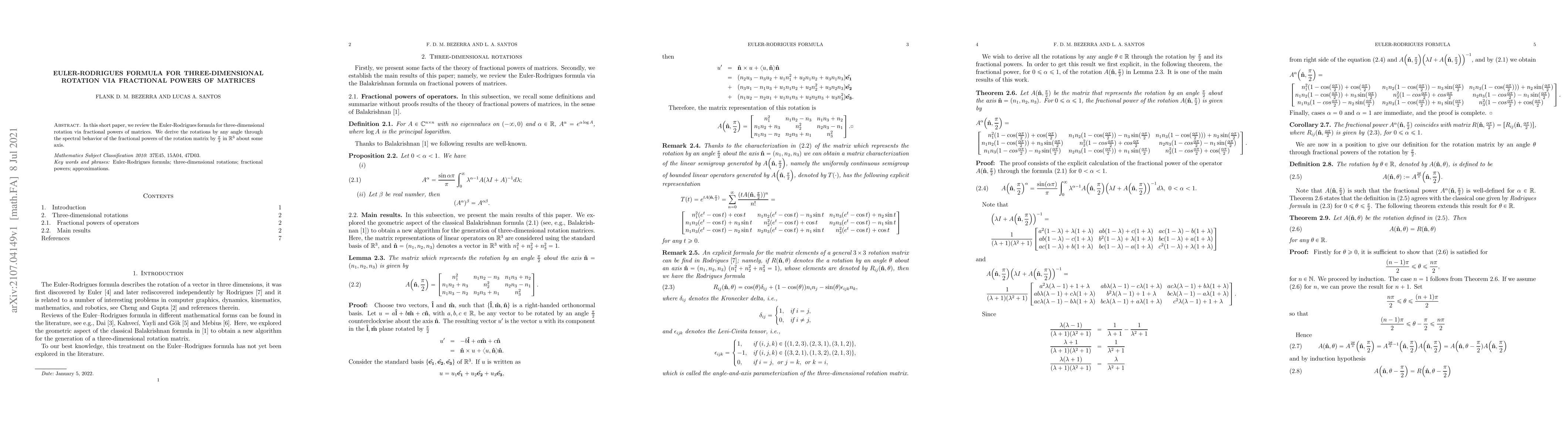 This paper reviews the Euler-Rodrigues formula for three-dimensional rotation using fractional powers of matrices, deriving rotations by any angle through the spectral behavior of the fractional power of the rotation matrix by $\frac{\pi}{2}$ in $\mathbb{R}^3$.