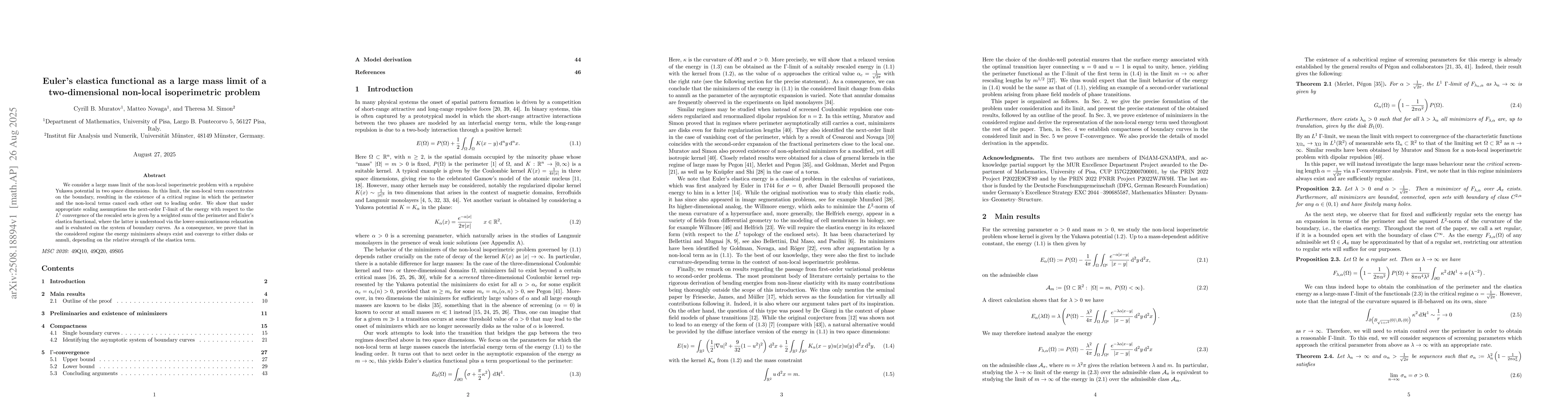 We consider a large mass limit of the non-local isoperimetric problem with a repulsive Yukawa potential in two space dimensions. In this limit, the non-local term concentrates on the boundary, resulting in the existence of a critical regime in which the perimeter and the non-local terms cancel each other out to leading order. We show that under appropriate scaling assumptions the next-order $\Gamma$-limit of the energy with respect to the $L^1$ convergence of the rescaled sets is given by a weighted sum of the perimeter and Euler's elastica functional, where the latter is understood via the lower-semicontinuous relaxation and is evaluated on the system of boundary curves. As a consequence, we prove that in the considered regime the energy minimizers always exist and converge to either disks or annuli, depending on the relative strength of the elastica term.