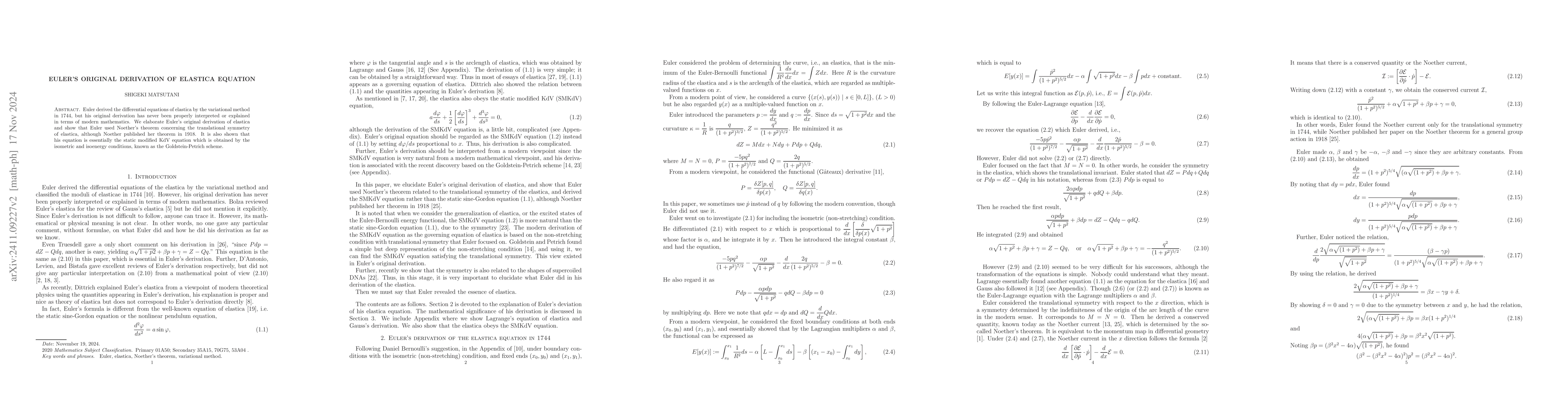The research elaborates on Euler's original derivation of the elastica equation using modern mathematics, showing Euler's application of Noether's theorem concerning translational symmetry, which was published later by Noether in 1918.