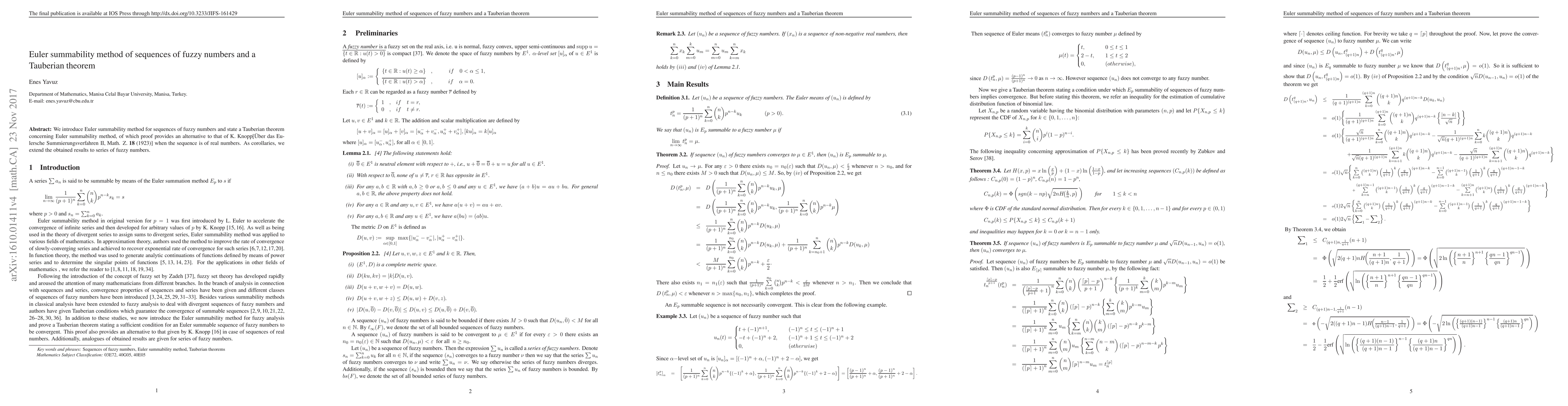 Summary: This paper introduces the Euler summability method for sequences of fuzzy numbers and presents a Tauberian theorem for this method, offering an alternative proof to that of Knopp. The results are extended to series of fuzzy numbers.