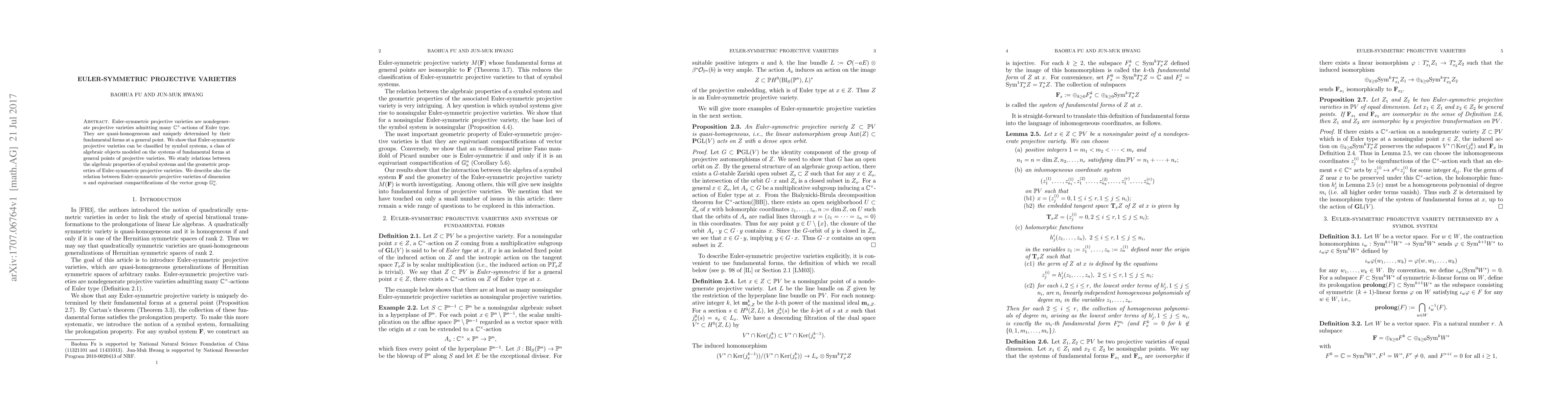 Euler-symmetric projective varieties are nondegenerate projective varieties admitting many C*-actions of Euler type. They are quasi-homogeneous and uniquely determined by their fundamental forms at a general point. We show that Euler-symmetric projective varieties can be classified by symbol systems, a class of algebraic objects modeled on the systems of fundamental forms at general points of projective varieties. We study relations between the algebraic properties of symbol systems and the geometric properties of Euler-symmetric projective varieties. We describe also the relation between Euler-symmetric projective varieties of dimension n and equivariant compactifications of the vector group G_a^n.