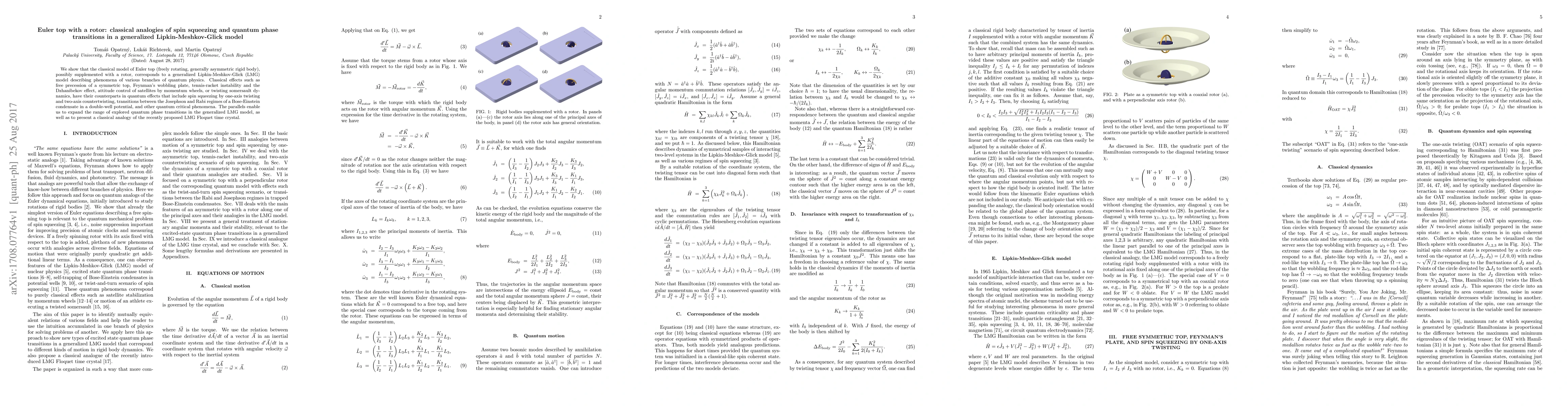 We show that the classical model of Euler top (freely rotating, generally asymmetric rigid body), possibly supplemented with a rotor, corresponds to a generalized Lipkin-Meshkov-Glick (LMG) model describing phenomena of various branches of quantum physics. Classical effects such as free precession of a symmetric top, Feynman's wobbling plate, tennis-racket instability and the Dzhanibekov effect, attitude control of satellites by momentum wheels, or twisting somersault dynamics, have their counterparts in quantum effects that include spin squeezing by one-axis twisting and two-axis countertwisting, transitions between the Josephson and Rabi regimes of a Bose-Einstein condensate in a double-well potential, and other quantum critical phenomena. The parallels enable us to expand the range of explored quantum phase transitions in the generalized LMG model, as well as to present a classical analogy of the recently proposed LMG Floquet time crystal.