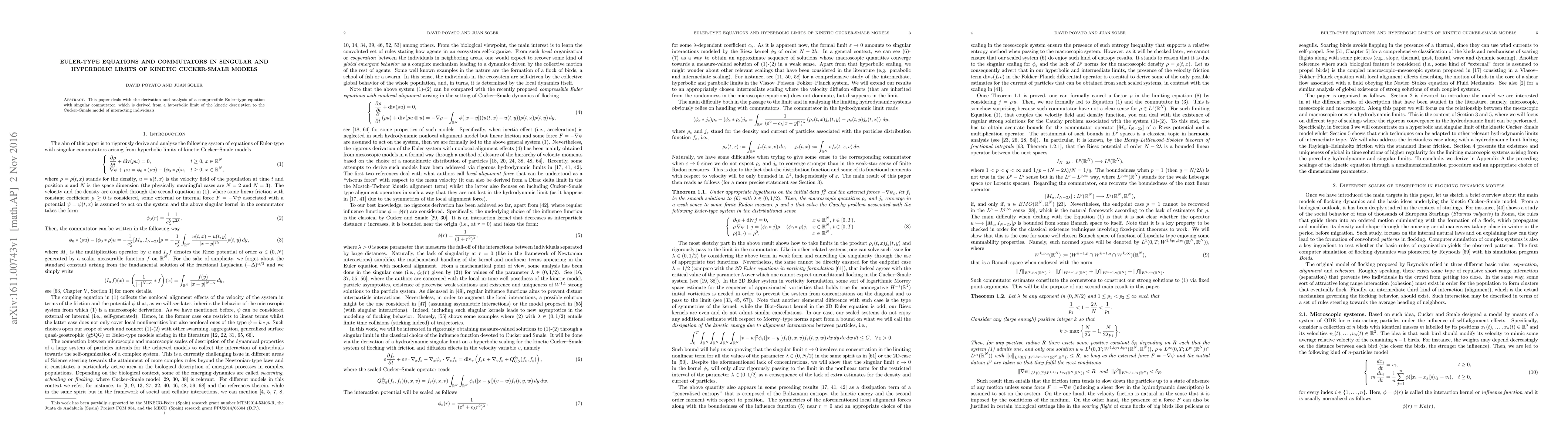 This paper deals with the derivation and analysis of a compressible Euler-type equation with singular commutator, which is derived from a hyperbolic limit of the kinetic description to the Cucker-Smale model of interacting individuals