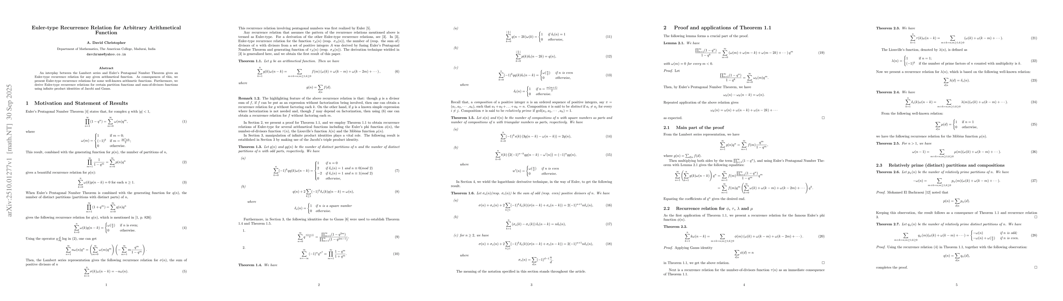 An interplay between the Lambert series and Euler's Pentagonal Number Theorem gives an Euler-type recurrence relation for any given arithmetical function. As consequences of this, we present Euler-type recurrence relations for some well-known arithmetic functions. Furthermore, we derive Euler-type recurrence relations for certain partition functions and sum-of-divisors functions using infinite product identities of Jacobi and Gauss.