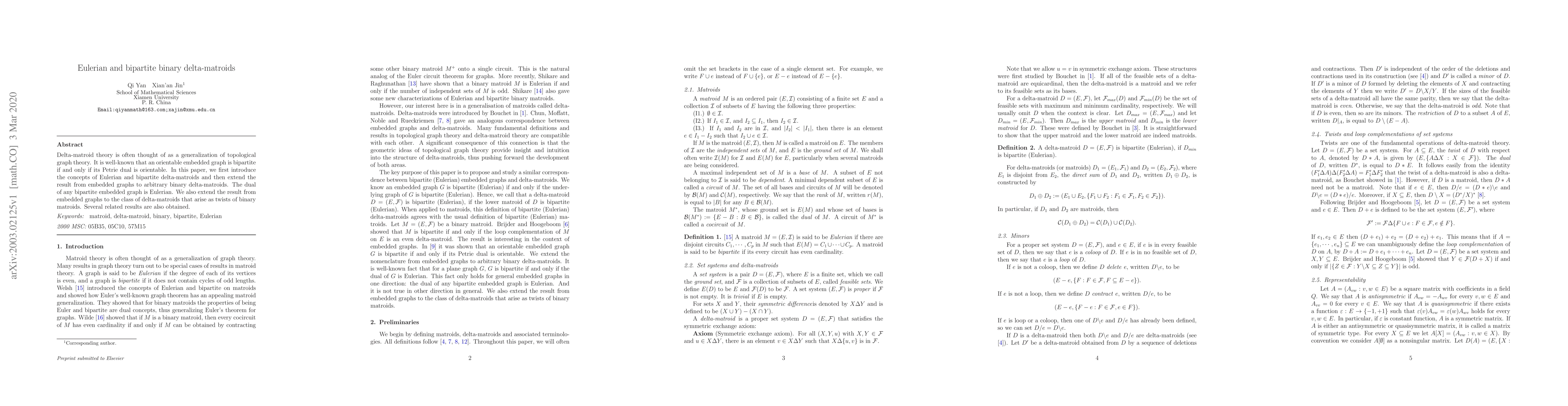 This paper introduces Eulerian and bipartite delta-matroids, extending the concept of bipartite graphs' Petrie duals to arbitrary binary delta-matroids, and proving that the dual of any bipartite embedded graph is Eulerian, with several related results obtained.