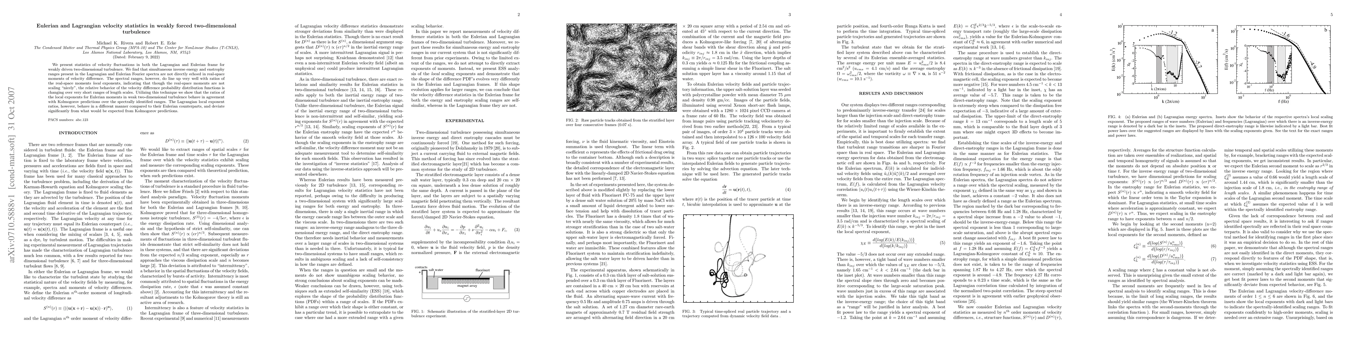 This paper investigates velocity fluctuations in weakly driven two-dimensional turbulence, comparing Lagrangian and Eulerian statistics. It finds that while real-space moments do not scale neatly, the relative behavior of velocity difference distributions aligns with spectral ranges, showing agreement with Kolmogorov predictions for Eulerian moments but significant deviation for Lagrangian moments.