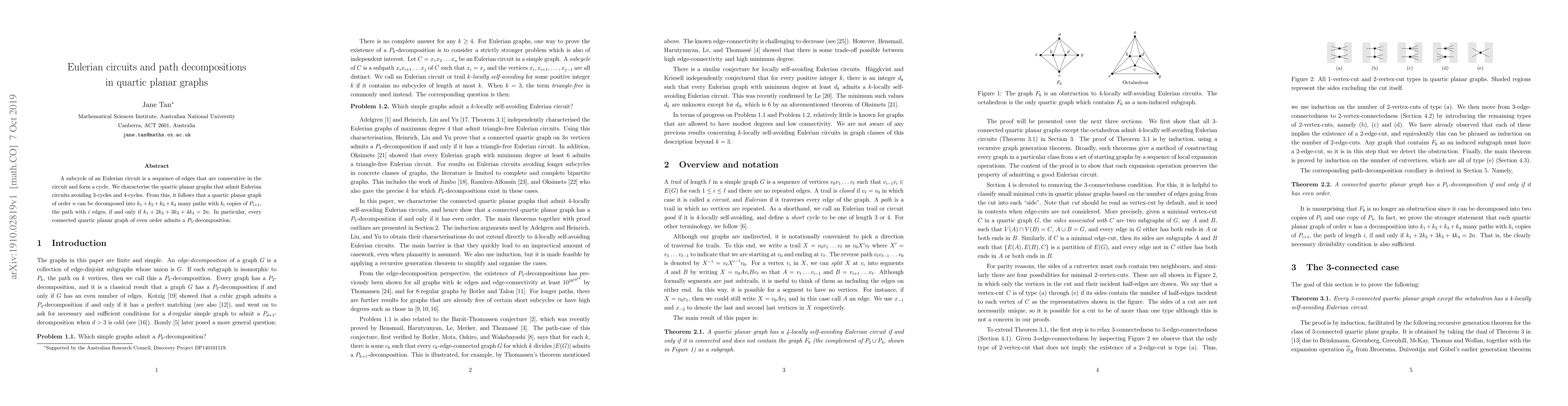A subcycle of an Eulerian circuit is a sequence of edges that are consecutive in the circuit and form a cycle. We characterise the quartic planar graphs that admit Eulerian circuits avoiding 3-cycles and 4-cycles. From this, it follows that a quartic planar graph of order $n$ can be decomposed into $k_1+k_2+k_3+k_4$ many paths with $k_i$ copies of $P_{i+1}$, the path with $i$ edges, if and only if $k_1+2k_2+3k_3+4k_4 = 2n$. In particular, every connected quartic planar graph of even order admits a $P_5$-decomposition.