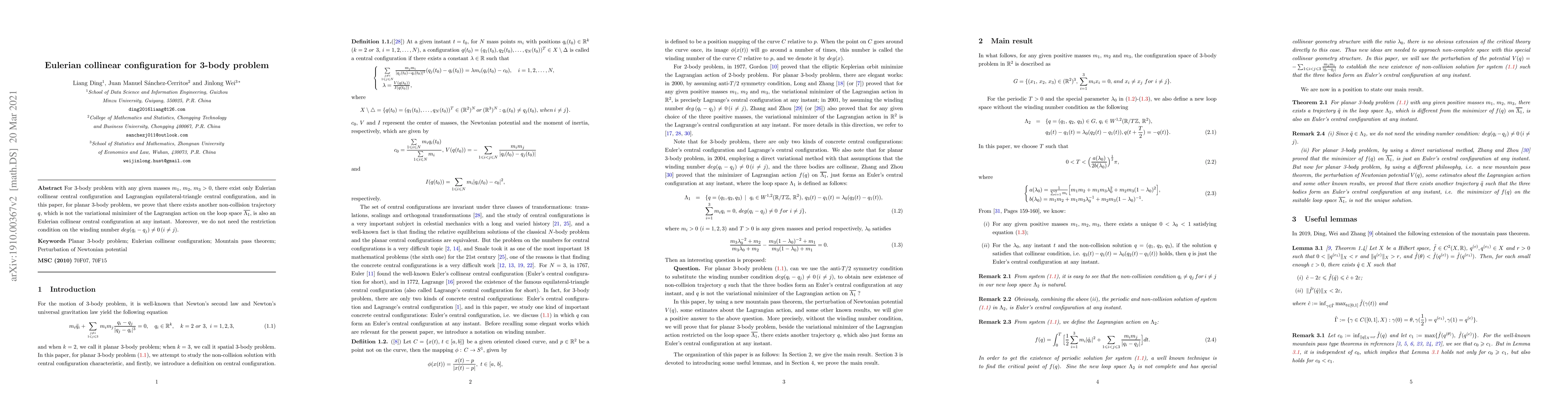 This paper proves the existence of a new non-collision Eulerian collinear central configuration for the planar 3-body problem, distinct from the Eulerian collinear and Lagrangian equilateral-triangle configurations. It removes the restriction on winding number, providing an alternative trajectory on the loop space that is not the variational minimizer of the Lagrangian action.