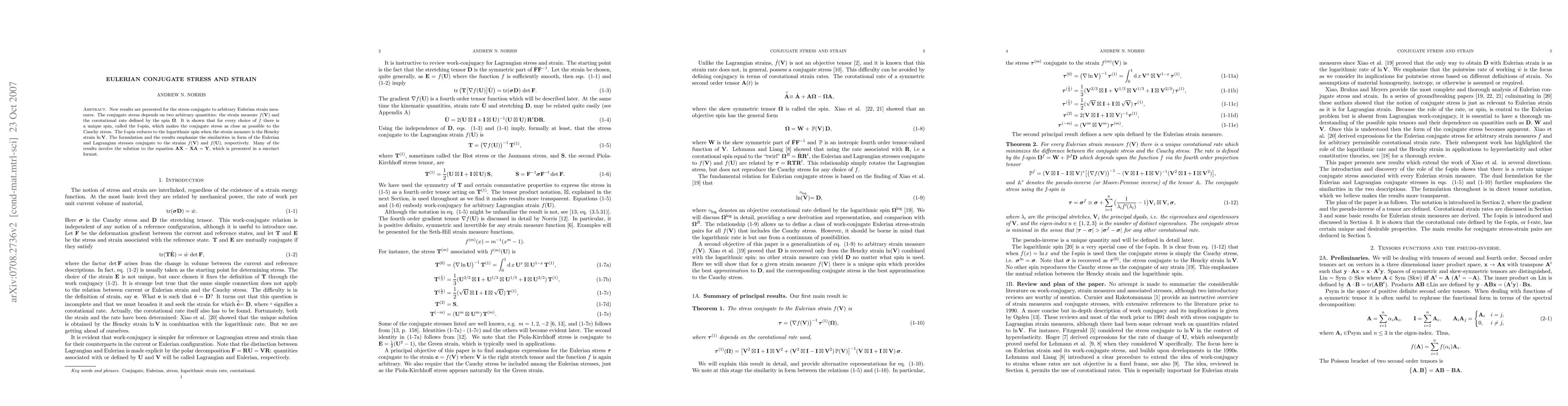 New results are presented for the stress conjugate to arbitrary Eulerian strain measures. The conjugate stress depends on two arbitrary quantities: the strain measure f(V) and the corotational rate defined by the spin \Omega. It is shown that for every choice of f there is a unique spin, called the f-spin, which makes the conjugate stress as close as possible to the Cauchy stress. The f-spin reduces to the logarithmic spin when the strain measure is the Hencky strain log(V). The formulation and the results emphasize the similarities in form of the Eulerian and Lagrangian stresses conjugate to the strains f(V) and f(U), respectively. Many of the results involve the solution to the equation AX-XA=Y, which is presented in a succinct format.