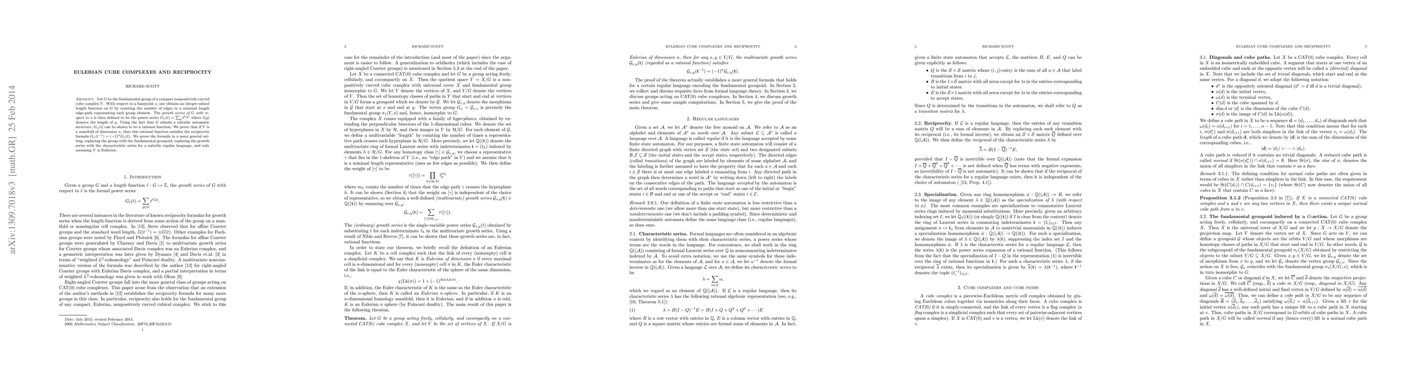 Let $G$ be the fundamental group of a compact nonpositively curved cube complex $Y$. With respect to a basepoint $x$, one obtains an integer-valued length function on $G$ by counting the number of edges in a minimal length edge-path representing each group element. The growth series of $G$ with respect to $x$ is then defined to be the power series $G_x(t)=\sum_g t^{|g|}$ where $|g|$ denotes the length of $g$. Using the fact that $G$ admits a suitable automatic structure, $G_x(t)$ can be shown to be a rational function. We prove that if $Y$ is a manifold of dimension $n$, then this rational function satisfies the reciprocity formula $G_x(t^{-1})=(-1)^n G_x(t)$. We prove the formula in a more general setting, replacing the group with the fundamental groupoid, replacing the growth series with the characteristic series for a suitable regular language, and only assuming $Y$ is Eulerian.